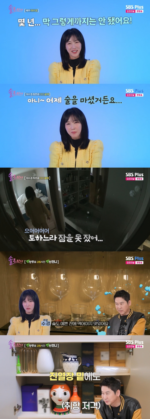 사진=SBSPlus·E채널[스포츠투데이김태형기자]배우이수경이털털한일상을공개했다.18일방송된SBSPlus·E채널'솔로라서'에는이수경의리얼한일상이그려졌다.이날스튜디오에는장서희,이수경이등장했다.두사람을마주한황정음은얼굴이빨개지며당황,급기야"제가봐도MC를너무못본다"고털어놨다.신동엽이"평소에하던것처럼해"라며웃자,황정음은"서희언니를되게오랜만에본다"고말했다.이에장서희는"예전에가라오케에서봤다"고밝혔고,신동엽은"그거찐이지.그쪽동창들은소중한인연이지"라고말해웃음을자아냈다.이어이수경의인터뷰가공개됐다.제작진이"얼굴에빛이난다"고하자,이수경은"세수안해서그렇다.스킨으로만닦았다.머리는감았다"고뜻밖의사실을고백했다.이를본황정음은"너무귀엽고무해하다"라고반응했다.이수경은"20몇년됐죠?꽤됐다.강산이일단두번은바뀐것같다"며"솔로가된지는적당히됐다.알아서연애도가끔씩하고썸도타고왔다갔다하다가솔로된지는좀됐다"고밝혔다.몇년차냐는질문에"몇년차까지는아니다.그렇게까지는안됐다.그렇게오래안됐다.알아서잘사는편이다"라고살짝발끈하며답했다.이에신동엽도"그렇게까지혼자있는분이아니다"라고밝혔다.공개된이수경의일상은오전11시까지잠을자는모습이었다.장서희가"계속이시간까지자냐"고묻자,이수경은"평상시에는계속이렇게"라며"4시간의법칙.4시간자고일어나거나,아니면8시간자고일어난다.그게몸회복에좋다고해서"라고답했다.침대에서몸을일으킨이수경은화장실에서세수를하더니갑자기토를했다.그는"어제술을마셨다.숙취때문"이라고밝혀충격과웃음을선사했다.이어"어찌저찌하다보니(술이)메이트가됐다.함께한세월이어언몇십년이됐다.매일다음날너무힘든데그날분위기가좋으니까먹게된다.죽었다살았다가계속반복이된다"며웃었다.신동엽은"방송에서숙취공개여자배우는최초아니냐.진짜술꾼인거다.구토를감수하면서마신다"고했고,이수경은"저예쁘게나온다면서요"라고발끈했다.이수경은자신의별명이'이술경'이라고덧붙였다.이어공개된이수경의와인셀러에는약120병의와인과샴페인이있었다.그는"술테크에성공한애들이많다"며"시세차익을가장많이본건정말많이올라서말씀드리기곤란하다"고말했다.그중현재판매최소가가수천만원이라고해모두를놀라게했다.또한세계최고가와인중하나도있다고덧붙여눈길을끌었다.[스포츠투데이김태형기자[email protected]]Copyright©스포츠투데이.무단전재및재배포금지.