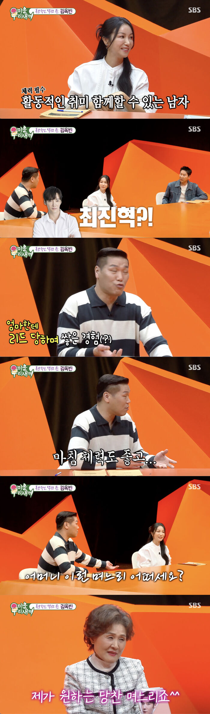 [SBS연예뉴스|김효정에디터]김옥빈의이상형이공개됐다.2일방송된SBS'미운우리새끼'(이하'미우새')에서는배우김옥빈이스페셜MC로등장했다.이날김옥빈은리드당해주는체력좋은남자가이상형이라고밝혔다.이에김옥빈은"내가요구가많고나가서뭔가를함께하는것을좋아한다"라며체력이필수라고설명했다.이를들은서장훈은"리드당해주는사람이라고하니까갑자기떠오른사람이있다"라며최진혁을언급했다.이어그는"최진혁은엄마한테그동안충분히리드를당해왔다.그래서잡아줄수있는사람이필요하다.체력도좋고아주맞춤형아닌가싶다"라고최진혁을추천했다.그러면서최진혁의어머니에게이런며느리가어떤지물었다.이에최진혁어머니는"제가원하는당찬며느리이다.기회되면한번만나봐달라"라고아들을어필해웃음을자아냈다.Copyright©CopyrightⓒSBS.Allrightsreserved.무단전재,재배포및AI학습이용금지