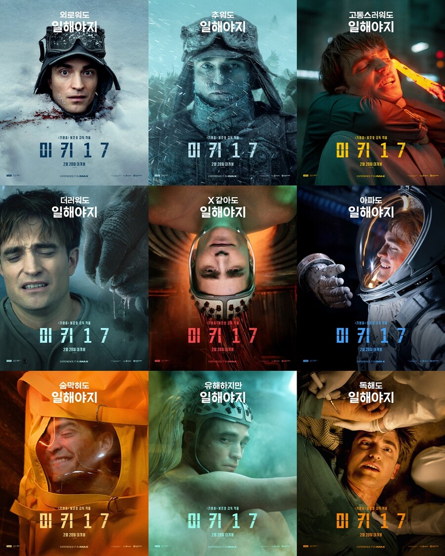 ▲미키17.제공ㅣ워너브러더스코리아아[스포티비뉴스=강효진기자]2025년2월28일세계최초한국개봉을앞둔봉준호감독영화'미키17'이주인공‘미키’의‘극한직업시리즈’캐릭터포스터를공개했다.위험한일에투입되는소모품(익스펜더블)으로,죽으면다시프린트되는‘미키’가17번째죽음의위기를겪던중,그가죽은줄알고‘미키18’이프린트되면서벌어지는예측불허의이야기를그리는영화'미키17'이죽는게직업인‘미키’의다양한노동현장과죽음의상황을재미있게담은9장의캐릭터포스터를공개했다.목숨걸고위험한일을도맡아하지만,죽으면새로출력되기때문에모두가그의죽음을당연히여기는‘미키’.공개된캐릭터포스터는‘미키1’부터‘미키17’까지,16번의죽음을겪은‘미키’의극한직업현장을생생한표정과상황으로보여준다.얼음행성으로향하는비행도중우주공간에서팔이잘리는것으로시작한그의죽음의역사는,얼음행성도착후에는인류의정착을위해꼭필요한여러가지실험과위험한업무에투입되는모습으로이어진다.숨이붙어있는데도바디백에담겨소각로에던져지고,맨몸으로유독가스에노출되고,테스트목적으로개발중인신약주사를맞는다.탐사업무도중얼음구덩이에구해주는사람없이혼자빠져있거나,얼음행성의크리처인크리퍼떼앞에극한추위에얼어붙은채홀로서있고,불에데이고,크리퍼의먹이가되는등‘미키’의고난은끝이없다.‘아파도,숨막혀도,유해하지만,독해도,외로워도,추워도,고통스러워도,더러워도’와‘일해야지’로구성된위트있는카피와상황은‘X같아도일해야지’라는결정적한마디로귀결된다.눈이오나비가오나아무리‘X같아도’일해서먹고사는우리모두의공감대또한건드린다.‘죽음’이직업이자일인‘미키’의온갖극한상황과로버트패틴슨의실감나는표정은영화속이야기를더욱궁금하게한다.SF라는장르의틀을넘어인간미와유머속에새로운세계와재미를보여줄봉준호감독의신작'미키17'은2월28일한국에서가장먼저관객을만난다.<저작권자ⓒSPOTVNEWS.무단전재및재배포금지>Copyright©스포티비뉴스.무단전재및재배포금지.