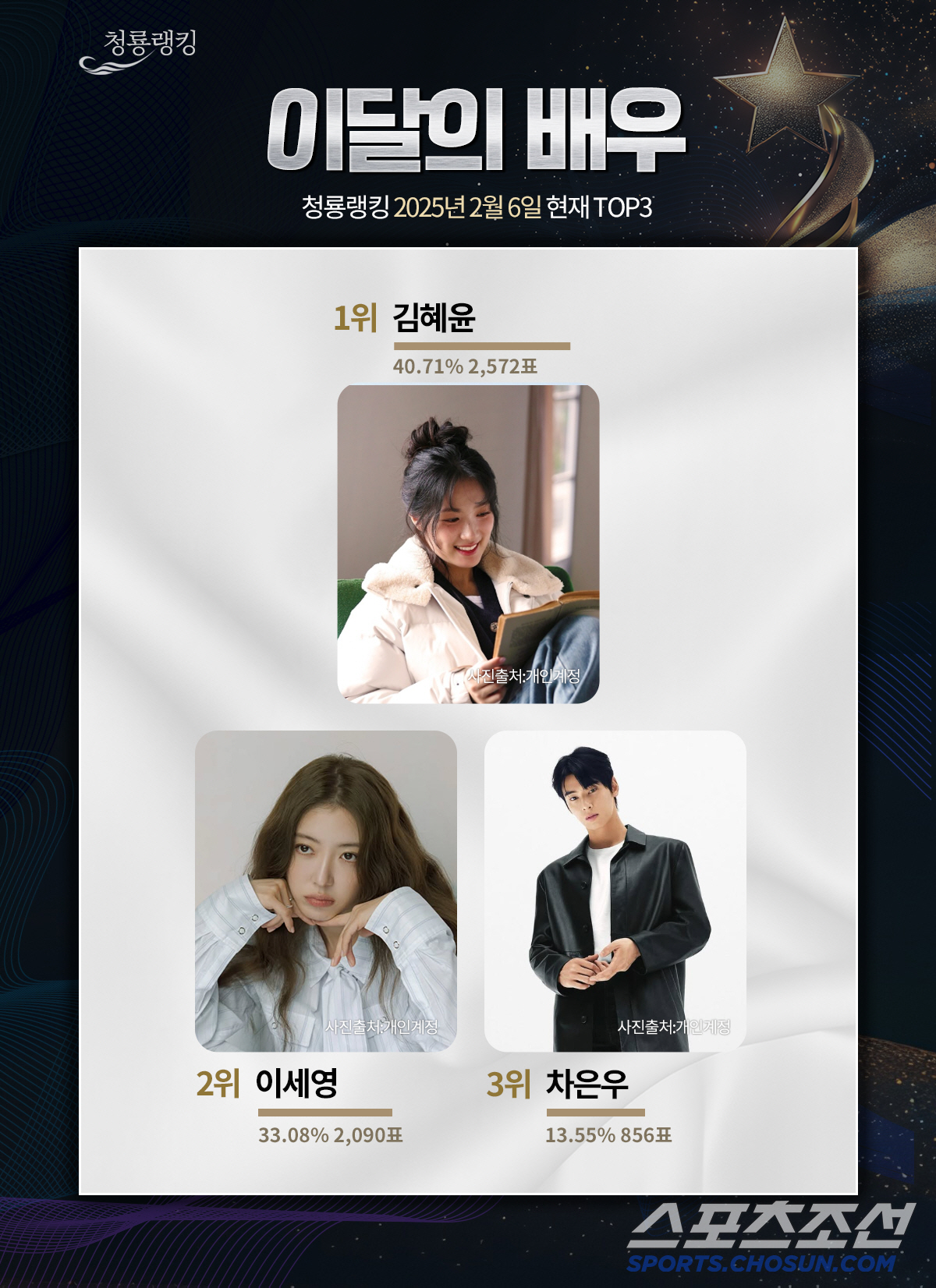 2월청룡랭킹현재순위'여신들의전쟁'이다.김혜윤이세영모두팬덤이단단한것으로유명한배우들.어느쪽이최종1위에오를지막판까지피튀기는자존심경쟁이예상된다.지난4일시작된2월청룡랭킹배우부문투표에서김혜윤이1위에올랐다.지지율40.80%다.지난달투표에서4위에머문김혜윤은이번투표에서는초반부터치고나오며팬들의응원을받고있다.지난해'선재업고튀어'로큰인기를끈김혜윤은그간글로벌팬투어등을통해해외에서도높은인기를입증했다.차기작을준비하고있는김혜윤은8월방송되는SBS드라마'오늘부터인간입니다만'에서인간이되지않으려고노력하는괴짜구미호은호역할을맡았다.능청스러운MZ구미호로로몬과'달달케미'를과시할계획이다.2위는33.08%지지를받고있는이세영이다.최근'모텔캘리포니아'에서눈을뗄수없는이국적인매력을지닌인테리어디자이너지강희역할로새로운모습과연기를선보이며주목받고있다.앞서이세영은tvN예능프로그램'텐트밖은유럽:로맨틱이탈리아'에서'열정막내'로큰사랑을받았다.이른아침부터식사를준비하고여행지의풍경에진심어린감동하는등소탈하면서도인간적인매력이팬들을열광케했다.워낙호감도가높은배우인만큼,막판까지김혜윤과뜨거운경쟁을벌일것으로예상된다.3위는13.55%의지지를얻고있는차은우다.매회투표마다1,2위에오르며뜨거운팬심을과시해온만큼,남은투표기간얼마든지반전의레이스를펼칠수있을것으로기대된다.한편'청룡랭킹'은청룡영화상과청룡시리즈어워즈의주최사인스포츠조선과셀럽챔프가함께진행하며,매달수상자선정과더불어반기별수상자를통해트렌드를이끌어가는화제의스타들을선정한다.6개월에한번씩뽑히는반기별수상자(베스트배우,베스트가수,베스트인플루언서)에게는트로피가주어진다.Copyright©스포츠조선.무단전재및재배포금지.