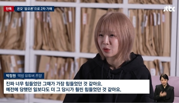 쯔양.사진|JTBC[스포츠서울|박경호기자]유튜버쯔양이허위사실과음모론으로시달리고있다며힘든심경을밝혔다.쯔양은지난21일JTBC뉴스와의인터뷰에나서‘중국간첩설’,‘정계연루설’등루머들에대해언급했다.쯔양은“한가지진실되게말씀드릴수있는건제가누구한테피해를끼치거나뭔가안좋은일을했다거나그런적은한번도없었다”라고목소리를높였다.쯔양은과거남자친구의괴롭힘보다사이버렉카들의공갈협박이더힘들었다며“예전에당했던일보다도더그당시가훨씬힘들었던것같다”고심경을밝혔다.쯔양은중국간첩관련루머에대해“저는중국가본적도없고진짜전혀아무것도없다.정치관련해서저와연관을지으시면,저는무슨이야기인지알아듣지도못한다”라며중국간첩설과정계연루설루머를부인했다.이어“뭔가어떻게든그냥저를죽이고싶어하는것같다고느껴질수밖에없는것같다”라며2차가해에대한고통을호소했다.한편,쯔양을협박해돈을갈취한혐의를받는유튜버구제역(이준희)이지난20일1심재판에서징역3년을선고받고법정구속됐다.주작감별사(전국진)는징역1년에집행유예3년과사회봉사160시간,카라큘라(이세욱)는징역1년에집행유예3년과사회봉사240시간,크로커다일(최일환)은징역벌금500만원을각각선고받았다[email protected]©스포츠서울.무단전재및재배포금지.