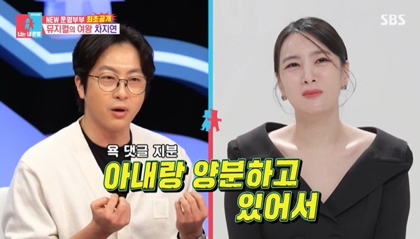 SBS‘동상이몽2너는내운명’캡처SBS‘동상이몽2너는내운명’캡처[뉴스엔유경상기자]전민기가‘동상이몽’출연후에아내와욕을나눠먹고있다고말했다.2월3일방송된SBS‘동상이몽시즌2-너는내운명’에서는결혼11년차배우차지연부부가합류했고,전민기가패널로함께했다.김구라는차지연에대해“건달스타일이다.가만히있으면무서워보이는연예인”이라고말했다.서장훈은“건달이야기를하니까워낙노래잘하고뮤지컬배우지만자꾸‘모범택시’가생각난다”고했다.김구라가“걱정되는게무서운이미지깨려고오버하는것아닌가”라며염려했고,차지연은“전혀그렇지않다”고자신했다.김숙이“일상을공개했다가더세게보이지않을까”라고묻자차지연은“그렇지않을거란자신감이있다.친근해지고싶다”고답했다.이어패널전민기에게김숙이“방송후에욕을엄청먹었다고.괜찮냐”고질문했다.전민기는“다양한채널을통해저에게욕을접수해주셨다”며“저도TV를보니욕먹을만한부분이있었다.다행인건욕을독식할수도있는데아내와양분해외롭지가않다”고답했다.또전민기는“갑자기제작진연락이왔다.차지연이오는데와서영상을꼭봐야한다고.음쓰못버리는분이또계신가?왜불렀는지모르겠다.차지연영상을꼭봐야한다고하더라”고반응해웃음을줬다.(사진=SBS‘동상이몽2너는내운명’캡처)뉴스엔유경상yooks@기사제보및보도자료[email protected]ⓒ뉴스엔.무단전재&재배포금지Copyright©뉴스엔.무단전재및재배포금지.