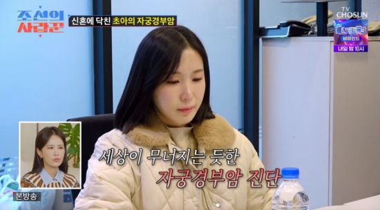 TV조선‘조선의사랑꾼’캡처TV조선‘조선의사랑꾼’캡처TV조선‘조선의사랑꾼’캡처TV조선‘조선의사랑꾼’캡처[뉴스엔하지원기자]'조선의사랑꾼'초아가신혼초에자궁경부암진단을받았다고밝혔다.2월3일방송된TV조선'조선의사랑꾼'에는크레용팝초아부부가새로운사랑꾼으로출연했다.초아는결혼1년차에받은산전검사에서자궁경부암을발견했다고운을뗐다.초아는"너무청천벽력이었다.너무갑작스러워서모든게.처음에는너무믿기지가않아서현실감이없었다"며"오빠한테이야기를할때눈물이나더라.손이막떨리고병원화장실에들어가서갑자기눈물이나서'나어떡해.나암이래'이렇게했던거같다"라고회상했다.초아남편역시현실감이없었다며"자궁을보호하는수술은안되고자궁을적출하는게매뉴얼이라고했다.사실그때부터힘든시기가시작이된거같다.(초아가)혼자화장실에서통곡을하더라.그때좀참았던감정들이터졌다"라며털어놨다.초아는"화장실에서꺼이꺼이울었다.그때남편도와서같이부둥켜안고울었던것같다"며눈물을흘렸다.초아는지난2023년암절제및가임력보존수술을받았다고한다.초아는"암수술은잘됐다.3개월마다검사하고있다"라고전했다.뉴스엔하지원oni1222@기사제보및보도자료[email protected]ⓒ뉴스엔.무단전재&재배포금지Copyright©뉴스엔.무단전재및재배포금지.