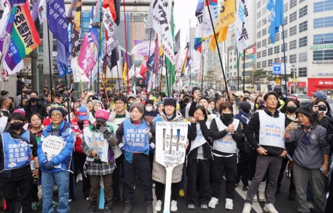 [현장]23일간구미~서울350km…'옵티칼고용승계로가는희망뚜벅이'마지막날1일광장이윤석열대통령탄핵찬반으로갈라진이때,'옵티칼고용승계로가는희망뚜벅이'행진이마지막걸음을옮겼다.이들은외국투자기업니토덴코의자회사인한국옵티칼하이테크(옵티칼)에서해고된노동자7명의고용승계를요구하며419일째고공농성중이던옵티칼지회조합원박정혜,소현숙씨를응원하는마음으로뭉쳤다.땅에남은옵티칼지회조합원들이검은옷을입고고용승계요구가적힌하늘색몸자보를동여맨채행진대열의맨앞에서걸었다.때로는씩씩하게,때로는담담하게보이는표정으로걷던이들은서울명동세종호텔이보일때쯤눈시울을붉히기시작했다.그들의눈이가닿는곳에는세종호텔에서정리해고된나머지노동자6명의복직을요구하며호텔앞10미터높이도로시설구조물에올라17일째농성중이던고진수세종호텔지부장이우뚝서있었다."박정혜,소현숙은공장으로돌아가야합니다"라고적힌부채를손에들고걷던김진숙민주노총부산본부지도위원도젖은눈으로망연자실한듯한표정을짓더니눈물을훔쳤다.바로옆박문진보건의료노조지도위원도고개를푹숙인채일그러진표정으로눈물을떨궜다.김지도위원은2012년한진중공업에정리해고철회를요구하며309일고공농성했다.박지도위원은2019년영남대의료원에해고자복직과노조활동보장등을요구하며227일고공농성했다.도무지바뀌지않는한국사회의잔인한일면으로인해아픔을겪은이들이한자리에서울고있었다.그러나그들곁에는그잔인한현실을함께바꿔보자며같이걷는사람들도있었다.▲1일서울명동세종호텔앞복직요구고공농성장앞에선'옵티칼고용승계로가는희망뚜벅이'참가자들.ⓒ프레시안(최용락)박정혜,소현숙응원하고국회에노동자해고문제관심요구한시민들지난달7일경북구미옵티칼공장에서시작해박씨와소씨가고공농성중인공장이있는경기평택을거쳐서울에닿은'옵티칼희망뚜벅이'행진이이렇게마무리됐다.이를제안한김지도위원과박지도위원을따라23일동안수많은이가약350킬로미터거리를걸었다.행진시작시간인이날오전10시경영등포역에는'옵티칼희망뚜벅이'의마지막을함께하려는노동자,시민500여명이모여있었다.이들은'서로가평등한존재임을인정하고존중한다'는내용이담긴'평등약속'을읽은뒤여의도국회까지2.5킬로미터거리를30여분간걷는것으로행진을시작했다.행진중<프레시안>과의인터뷰에서시민들은박씨와소씨를응원하는마음을전했다.대구에서온이슬기씨(30)는"저도공장을다니는입장에서두분에게감정이입이많이됐다"며"두분의복직이꼭이뤄지기를바란다"고말했다.라이더유니온조합원이문기씨(27)는"(지난1월)라이더대행진을할때옵티칼문제를알게됐다"며"회사에다니던동생이얼마전부당해고를당해두분에게더마음이쓰이기도했다"고말했다.이어"빨리지상에내려오셔서맛있는밥도먹고힘냈으면좋겠다"고밝혔다.두딸,배우자와함께온최성은(40)씨는"아이들이'올라가신두분은좋은분이야?'라고물어서'자기권리를생각하는당당한분이야'라고답했다"며"멀리있어마음으로만연대하지만'힘내시라'는말씀을드리고싶다.당당한분들이라자랑스럽다"고힘주어말했다.국회앞에서참가자들은"옵티칼고용승계국회가나서라"는구호를외치며박씨와소씨의고공농성에대한정치권의적극대응을촉구하는기자회견을열었다.구미가고향이라고밝힌한시민은회견에서"(박씨와소씨의고공농성장아래있는)'희망텐트에간다'고말씀드리니,어머니께서'거기(구미공단)는20,30년전에도공장지붕이랑굴뚝에사람들이많이매달렸는데아직도그러냐'고하셨다"며"언제까지사람들이먹고살기위해건물옥상에오르고,길바닥에서밤을새야하나.국회는노동자의부당해고문제에훨씬더관심을기울여야한다"고호소했다.▲1일서울영등포역에서국회로'옵티칼하이테크고용승계로가는희망뚜벅이'참가자들이행진하고있다.ⓒ프레시안(최용락)세종호텔고공농성장"함께싸우고함께승리하자"애초이날행진은국회에서끝날예정이었지만,지난달17일고지부장이세종호텔정리해고노동자6명의복직을요구하며고공농성에돌입함에따라명동세종호텔을거치는것으로행진경로가바뀌었다.최근정국등을고려해마무리장소는명동에서멀지않은광화문광장으로결정됐다.(☞관련기사:25년차일식요리사가세종호텔앞10m고공에오른이유)국회에서고지부장의고공농성장이있는세종호텔앞까지8킬로미터를행진하는데는두시간가량이걸렸다.세종호텔에도착하자김지도위원은고공농성장으로다가가고지부장에게"어디아픈곳은없느냐"고안부를묻고"끝까지힘내시라"고격려의말을전했다.고지부장은"포기안하고끝까지투쟁하겠다"고밝혔다.옵티칼지회조합원들도고공농성장아래로가눈물을흘리며고지부장에게안부를묻고응원의뜻을전했다.고지부장도잠시눈물을훔치더니곧"내가여기와서한번도안울었는데울잖아요.지금"이라며웃어보였다.이어"같이힘내자"고말했다.이어진집회에서이지영옵티칼지회사무장은울먹이는목소리로"고진수동지저희왔다.늦게와서너무죄송하다"며"처음고공에올랐다는소식을듣고가슴이많이아팠다.저희두언니들이고공에처음올랐을때생각이많