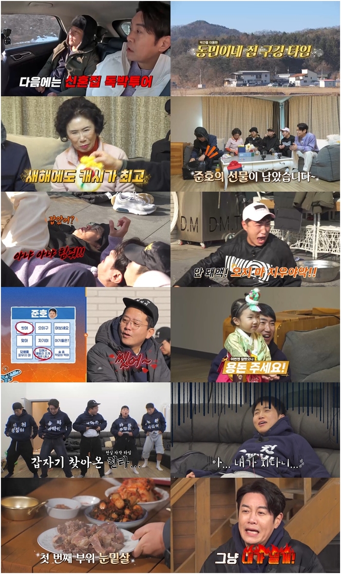“지민이가입에서을왕리조개썩은내난다고...”사진I채널S,K·star,NXT‘독박투어3’의홍인규가시즌3첫국내여행에서‘스트레이트3독’으로‘최다독박자’에등극해무려100만원상당의다음여행지숙소비결제하기벌칙에당첨됐다.2월1일방송된‘니돈내산독박투어3’(채널S,SK브로드밴드,K·star,NXT공동제작)23회에서는김대희x김준호x장동민x유세윤x홍인규가2025년새해를맞아강원도원주시에있는장동민본가로‘친구집독박투어’를떠난현장이그려졌다.특히‘80년생원숭이띠동갑내기’유세윤과홍인규는여행초반,“우리작년에삼재끝났대,‘독박’안걸리길~”이라며의욕을내뿜었지만,홍인규가스트레이트3독으로‘최다독박자’가되는가하면,유세윤이영하10도의강추위속‘야외취침하기’벌칙을받게돼한치앞을예상하기힘든‘독박게임’의묘미를제대로느끼게했다.이날‘독박즈’는‘친구집’독박투어를위해장동민의본가인강원도원주시로떠났다.“을사년,가보자고!”를외친김대희는“이렇게된거우리한집씩다돌아볼까?다음에는준호신혼집독박투어어때?”라며너스레를떨었다.홍인규는이에“나얼마전에준호형이(김지민에게)프러포즈한거보고엄청울었다”라면서‘예비신랑’김준호를바라봤다.김준호는“사실여러감정이들어서눈물이났다.나이도있지,조건도지민이에게미안하지,그리고두려운마음도있었다.또실패하지는않을까하는…”이라며울컥했다.이어그는“만약임원희형이나이상민형이누굴사랑해서결혼하게된다면나도울것같다”고해김대희,유세윤,홍인규를숙연(?)하게만들었다.진솔한대화중장동민의본가에도착한‘독박즈’는장동민어머니와큰딸지우에게반갑게인사했다.이어방이무려10개에PC방과스크린골프방까지갖춘장동민의대저택을둘러봤으며,각자준비한선물을장동민어머니에게전달했다.훈훈한선물증정식후,‘독박즈’는‘장동민어머니선물비독박자’뽑기게임을했다.물이가득찬대야를발로버틴채옮기는게임에서김대희는물을왕창쏟았고,“팬티까지다젖었다”며절규했다.그럼에도게임이좀처럼끝나지않자장동민은“새해기념으로,어머니선물비는다같이‘무독’으로하는게어때?”라고제안했고이에모두가흔쾌히합의했다.훈훈한분위기속,‘독박즈’는장동민이특별히준비한‘소머리’를다같이손질했다.무려25만원상당의‘최상급소머리’를공수해온장동민은‘소머리’손질법을알려줬으며,‘독박즈’는소의잔털을뽑는왁싱및스케일링을함께했다.그러던중‘독박즈’는“오늘‘최다독박자’벌칙은뭘로할까?”라며,“다음여행지에서최고급숙소비결제하기로하자!”고말했다.직후,점심식사비를건‘묻고더블로가는2독’독박게임을했는데,‘아내가자주하는말빙고게임’에서김준호는승부욕에눈이멀어,“(오빠)입에서을왕리조개썩은내나!”라는김지민의발언을빙고칸에넣었다.이를확인한홍인규는“지민이가저말할때내가옆에있었다”고증인을자처해대환장케미를발산했다.각종폭로가난무하자,장동민은“대체무슨얘기들을듣고사는거냐!”고외쳐짠내웃음을더했다.자신은물론아내의이미지를추락(?)시키는각종발언이속출한끝에홍인규가꼴찌를했고,순식간에‘2독’이된홍인규는점심식사비를냈다.짜장면으로식사를하던중김준호는“인규가요즘우리신혼집알아보는거도와주고있다”며결혼준비이야기를꺼냈다.이어“집위치는‘샵세권’(미용실근처)이면좋을것같다.내조건은상관없다.(김지민에게)다맞춰줄수있다”고강조해모두를놀라게했다.식사후엔장동민의큰딸지우의세배를받았다.‘삼촌미소’를장착한채지우에게용돈을건넨‘독박즈’는지우가퇴장하자‘세뱃돈내기’독박게임을했다.‘카드를입으로불어서한장도남기지못하는사람이독박자가되자’라고한가운데,홍인규가꼴찌를해스트레이트3독으로‘최다독박자’가됐다.그는“나삼재끝났다고했는데”라며한숨을쉬어짠내웃음을안겼다.이후소머리수육을중간점검한‘독박즈’는장동민이준비한원주의향토음식메밀전과막걸리를먹으면서담소를나눴다.이때장동민은“원주는강원도제1의도시”라며,“준호형이좋아하는골프장도많아서준호형에겐천국일것”이라고자랑했다.그런데김준호는“난이제지민이를위해살고싶어”라고뜬금포사랑고백을해분위기를급속냉각시켰다.썰렁한분위기속,김준호는“이따잠자리배정놓고벌칙으로야외취침하기어때?”라고돌발제안했고,‘허리에매단소시지를입으로받아먹기’대결을한끝에유세윤이꼴찌를했다.드디어대망의‘소머리수육’이완성됐고,마당에모인‘독박즈’는장동민의어머니가썰어주는소머리수육을부위별로맛보며행복해했다.김대희는“부위마다씹는맛이다다르다.1인당10만원이라해도아깝지않다”며“어머니에게수고비로50만원을챙겨드리자”고이야기했다.이에‘독박즈’는‘오징어게임’속캐릭터영희장난감을이용한마지막독박게임을했다.여기서김대희가독박에당첨돼흔쾌히50만원을냈다.또한‘야외취침’벌칙을받게된유세윤은마당에서홀로텐트를치고잠들어,‘걸리면무조건한다’라는‘독박정신’의위대함을보여줬다.‘독박투어3’는채널S,K·star,NX