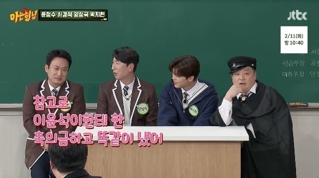 개그맨서경석이가수민경훈에게늦은축의금을건넸다./JTBC'아는형님'[마이데일리=김하영기자]방송인서경석이가수민경훈에게늦은축의금을건넨사연을공개했다.지난1일방송된JTBC'아는형님'에는'사투리특집'을맞아강원도,충청도,경상도,전라도에서온개그맨윤정수,서경석,양상국과가수박지현이출연했다.이날서경석은평소전학생신청서를받는이수근이아닌민경훈에게다가가“경훈이에게할말이있다”고운을뗐다.그는"내조카가민경훈콘서트를꼭한번보고싶어했다.그래서안친하지만용기내서연락했는데,너무잘챙겨줘서조카가울지경이었다"며민경훈에게감사한마음을전했다.이어"덕분에좋은삼촌이될수있었다"며고마움을표현했다.그러면서"내조카가(민경훈의)콘서트꼭한번보고싶다더라.그래서안친한데연락을한거다.그런데너무잘해주고조카가울지경이더라.그래서꼭한번인사하려고했다"고설명했다.개그맨서경석의손편지/JTBC'아는형님'서경석은또"경훈이가결혼할때청첩장이올줄알고기다렸는데,부담될까봐안보낸것같더라"며"충청도는또안부르면안간다.그래서기다리다가언젠가만나면주려고축의금을챙겨왔다"고말하며축의금과직접쓴손편지를건넸다.손편지를읽은민경훈은감동한모습을보였고서경석은"그조카가지금방송작가가됐다.그래서경훈이를섭외하려했는데매니저님이안나간다고했단다"고폭로해웃음을자아냈다.이어"참고로이윤석한테준축의금과똑같은금액이다"라고덧붙여현장을폭소케했다.한편서경석은'자격증부자'면모도공개했다.그는"공인중개사자격증을땄고,방송을하면서한국어교원2급자격증도취득했다.외국인에게한국어를가르칠수있는자격증"이라며놀라운학구열을드러냈다.현재한국사공부에빠져있다는그는"1급을이미땄지만,이번에는100점을목표로다시도전중"이라며"총3번시험을봤는데79점,94점,99점을받았다"고말해놀라움을자아냈다.그는한국사공부를시작한계기에대해"이름이'서경석'인사람들의모임이있다.그중큰형님이사회복지법인회장이신데어르신들이공부를정말좋아하신다더라.그래서재능기부로강의를하고있다"며"다음달시험에그분들15명이함께응시할예정이다.평균연령이69세"라고밝혀훈훈함을자아냈다.Copyright©마이데일리.무단전재및재배포금지.