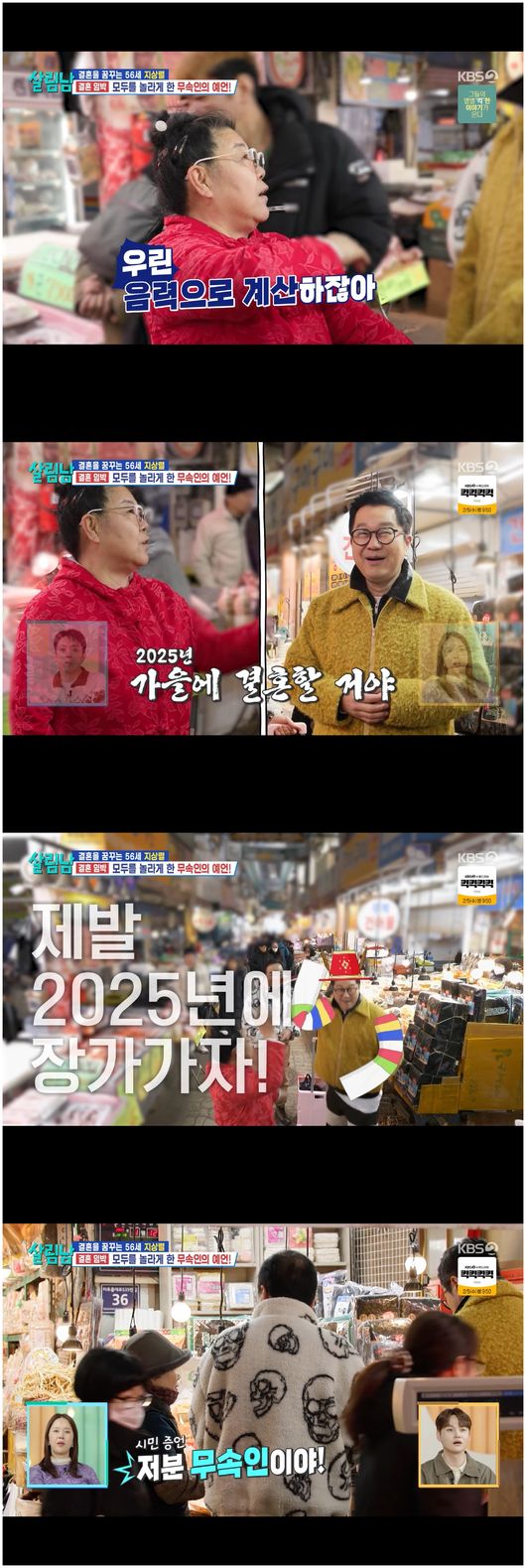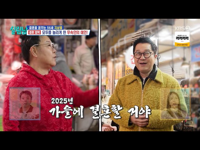 [OSEN=오세진기자]'살림남2'지상렬이55세에결혼한다고밝혀져시선을끌었다.1일방송된KBS2TV예능'살림남2'에서는딸과함께추억을만드는박영규의모습,그리고55세생일을맞이해주변사람들로부터결혼을독촉받는지상렬의모습이그려졌다.박영규는세번째불후의명곡에출연했다.이번출연은딸조아나양과함께였다.박서진은“불후의명곡상2번탔다”,은지원은“저도문희준이랑현진영이랑무대를꾸려서우승트로피를탔다”라면서이력을자랑했으나박영규는앞선두번의출연모두첫라운드에서탈락했다.그만큼의욕이넘치는박영규.박영규는“만약불후의명곡에서수상을하면소감을어떻게할거냐”라며딸에게물었다.딸은“아무리봐도설레발같다.그리고목아끼신다고하지않았다”라며차분하게들뜬아빠를달랬다.그러나딸의투혼에도이들부녀는탈락했다.신동엽은“너무고생하셨다”라면서“그렇게어려운노래를부르면점수가많이안나온다”라며조언했다.박영규는“딸이몇살이냐.딸어떻게하면잘기를수있냐”라며내친김에육아비법을물었다.신동엽은“딸은고2다.용돈많이주면된다.형님은자동차로프로포즈를했으면서,왜딸한테는안하냐”라고말해웃음을안겼다.지상렬은55세생일을맞이했다.형수는“지상렬의서프라이즈생일파티를해주려고시장에보냈다”라고말했다.매해지상렬의생일상을챙겨주는형수는올해도어김없이잡채,갈비찜,산적,샐러드,미역국은빼놓지않고준비했다.영문모른채심부름을나선지상렬은상인이“과일이새콤달콤하니맛있다”라고말하자“옛날에여자친구가있었는데애칭이있었거든.내가새콤이고걔가달콤이”라고말하며옛추억에잠겼다.또한많은이가지상렬을보고아는체를했다.길가다만난무속인은“내년에결혼한다”,“2025년가을에결혼한다”라고말해지상렬을환히웃게만들었다.지상렬의결혼프로젝트를위해김용명이초대됐다.형수는“김용명은결혼해서아이도낳고가정을잘꾸리지않았냐.지상렬에게보여주고자초대를했다”라며초대이유를밝혔다.백지영은“그게진심이라면문제가있다고본다.장난으로‘너만한여자없다’라고말을하는데,쑥스럽다고농담이나장난으로다가가서는안된다”라며지상렬만의접근방식에대해조언했다.지상렬은“예전에는그냥,뭐,조카랑같이낚시간친구가생각이난다”면서“옛날에는여자친구랑있다가술마시자고연락오면그냥가고그랬다”라고말해모두를깜짝놀라게했다.김용명은“옛날에외국여자도만나지않았냐”라고말했고,백지영은“옥산나라는여인이있었는데,결혼을하려고했는데상대여자가아이가있어서헤어졌다고하더라”라고증언해시선을끌었다./[email protected][사진]KBS2TV예능'살림남2'방송화면캡처Copyright©OSEN.무단전재및재배포금지.