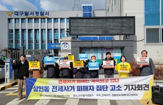 임대인에대한집단고소장경찰제출[대구=뉴시스]이상제기자=전세사기·깡통전세피해대구대책위원회가6일대구달서경찰서앞에서상인동전세사기피해자집단고소기자회견을하고있다[email protected]*재판매및DB금지[대구=뉴시스]이상제기자=대구에서또다시수십억대전세사기피해자들이나왔다.이들은6일대구달서경찰서앞에서기자회견을열고건물소유주를상대로고소장을접수했다.전세사기·깡통전세피해대구대책위원회(대책위)는이날"전세사기피해자지원및주거안정에관한특별법개정이시급하다"며"여야는정치적공방을멈추고피해자들을위한특별법기한연장과추가개정법안을조속히처리하라"고촉구했다.대책위는"다행히지난2월전세사기특별법유효기간을현행2년에서4년으로연장하는개정안과피해자가긴급복지지원을받을수있도록하는개정안이발의됐다"며"그러나탄핵정국속에서국회국토교통위원회에법안상정조차불투명한상황"이라고주장했다.이어"상인동전세사기피해자들은가해임대인에대한집단고소장을오늘제출한다.이와함께전세사기피해자인정신청을준비하고있다"며"피해자들의구제와가해임대인처벌을위해함께할것"이라고말했다.대책위에따르면달서구상인동다가구주택4곳에서세입자19명이전세보증금22억원을돌려받지못하고있다.지금까지확인된피해정도만건물4채에33가구다.이들다가구주택은최근경매절차에들어갔거나개시를앞두고있다.전세보증금을돌려받지못한피해자들은대부분20~30대청년들인것으로알려졌다.이들이받지못한보증금은적게는4000만원에서많게는2억4500만원에달한다.이들은대부분후순위임차인으로경매절차가완료되더라도전세보증금을돌려받지못하는상황이라고한다.건물소유주는지난해초세입자들에게은행이자를대신내달라고요구하기도한것으로알려졌다.상인동전세사기피해자A씨는"지난해4월임대인이세입자들을불러모아본인의경제적상황이녹록지않으니관리비를10만원씩인상해대출이자를갚는데직접보태달라고했다"며"이말을듣고사건의심각성을인지하기시작했다"고주장했다.A씨는"그럼에도상황이나아지기는커녕건물이경매에넘어가모든세입자의보증금이결국지켜질수없게됐다"며경찰등에임대인에대한적극적인수사를요청했다.☞공감언론뉴시스[email protected]©뉴시스.무단전재및재배포금지.