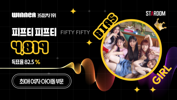 ▲피프티피프티가1월넷째주스타덤'최애아이돌'여자부문주간랭킹1위를차지한투표결과이미지.[스포티비뉴스=김원겸기자]피프티피프티가스타덤'최애아이돌'17주연속1위를기록하며장기집권을이어갔다.피프티피프티는1월넷째주(집계기간1월20일~1월26일)스타덤'최애아이돌'여자부문주간랭킹정상에올랐다.10월첫째주처음1위에오른후내리17주연속최정상의자리를굳건히지켰다.피프티피프티는집계기간동안득표율82.5%의압도적수치로1위를차지했다.2위는득표율13.3%의프로미스나인이자리했다.한편,'최애아이돌'남자부문에서는임영웅이2주연속1위를차지했다.'최애트롯스타'남녀부문에서는손태진,김의영이나란히1위에올랐다.'최애루키아이돌'남녀부문은호라이즌과유니스가각각정상을차지했다.다양한부문의랭킹을보여주는'스타덤'은스타와팬들을연결해주는모바일애플리케이션으로,'나의최애셀럽을우주대스타로만든다'는캐치프레이즈아래스타와팬들을다양한방식으로연결한다.팬들이질문을하고스타가답을해주는'스타톡'도꾸준히진행되고있다.유니스,최수호,손태진이이미참여해팬들의뜨거운호응을얻었다.싸이커스,소디엑,제이디원,드리핀,더킹덤티아이오티도참여했다.<저작권자ⓒSPOTVNEWS.무단전재및재배포금지>Copyright©스포티비뉴스.무단전재및재배포금지.