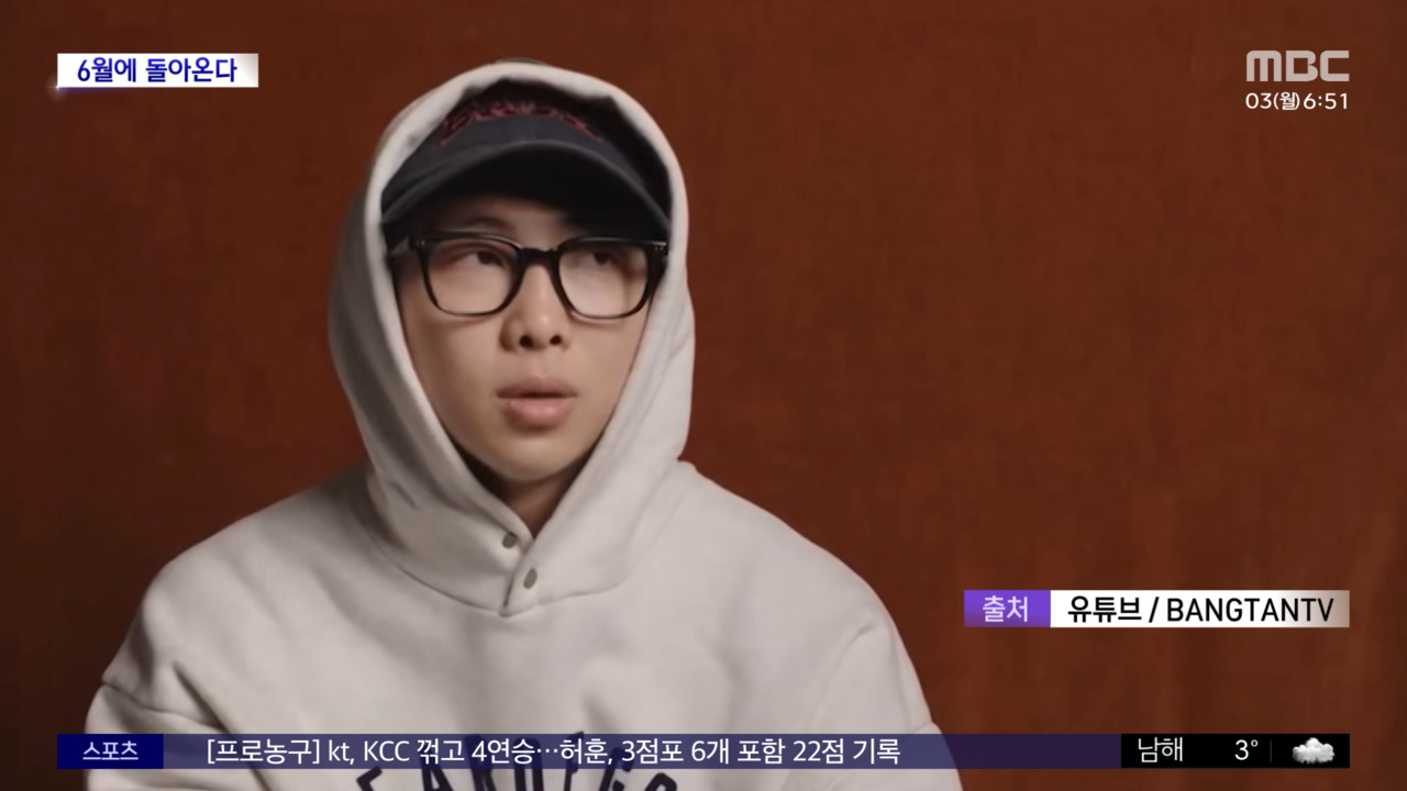 [뉴스투데이]방탄소년단멤버RM이팬커뮤니티를통해병장계급장을선보이며진급을신고했습니다.팬들에게쓴글에서RM은,"뭘했다고벌써한국나이로서른둘이됐는지모르겠다"라면서"아마이제4명전원병장일거다"라고적었는데요.자신을포함해군복무중인정국과지민,뷔를말한것으로"다음계급이민간인이라는게행복하다","군생활이넉달정도남았다"며전역에대한기대도살짝내비쳤습니다.앞서멤버지민역시팬플랫폼을통해"정말괜찮은모습으로복귀하겠다"며,활동재개에대한의지를드러냈는데요.BTS는군복무중인멤버모두올해6월전역하는만큼,지민이선사하겠다고한'최고의무대'가벌써부터기다려집니다.MBC뉴스는24시간여러분의제보를기다립니다.▷전화02-784-4000▷이메일[email protected]▷카카오톡@mbc제보김옥영리포터기사원문-https://imnews.imbc.com/replay/2025/nwtoday/article/6682483_36807.htmlCopyright©MBC&iMBC무단전재,재배포및이용(AI학습포함)금지