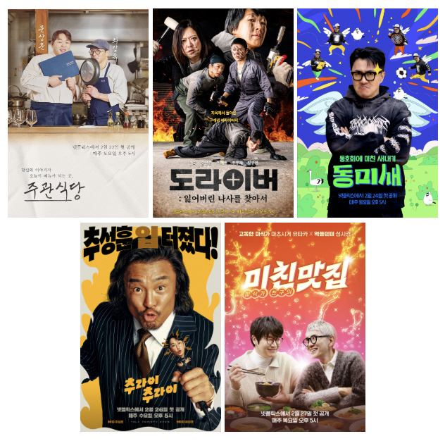 넷플릭스주관식당포스터(서울=뉴스1)윤효정기자=엔터테인먼트스트리밍서비스넷플릭스가'일일예능'을선보인다.넷플릭스는3일새로운예능프로그램5편론칭소식을알렸다.토크쇼,캐릭터버라이어티,동호회탐구,미식여행등다채로운장르와소재로총5편이다.각작품은30분이내의부담없는분량으로강한재미를선사할예정이다.정해진회차없이매주새로운구성과게스트로1년내내신선한즐거움을더할것으로기대된다.먼저오는22일을시작으로매주토요일에는요리토크쇼'주관식당'이공개된다.'주관식당'은최강록,문상훈이정해진메뉴없이세상에단하나뿐인주관식요리를만드는요리토크쇼로매주새로운게스트가손님으로출연한다.베일에가려진손님의개성과사연이담긴주관식주문서를받은식당주인최강록이요리에진심을담는다.여기에주관식당의심리적지주이자파트너문상훈이가세해손님맞춤형요리를완성한다.김태호PD가설립한제작사TEO의채송이PD가연출을맡았다.넷플릭스도라이버포스터23일부터매주일요일'도라이버:잃어버린나사를찾아서'가찾아온다.신선한재미로큰사랑을받았던'홍김동전'박인석PD와환상의오남매김숙,홍진경,조세호,주우재,장우영의재회가기대를높인다.'도라이버'는상위99%코믹인재들이나사없이인생의희로애락을조립하는'구개념'캐릭터버라이어티쇼다.게임,분장,벌칙,여행,먹방,토크등가리지않고상상이상의격한에피소드들이매주펼쳐진다.넷플릭스동미새포스터24일부터매주월요일공개되는'동미새:동호회에미친새내기'는데프콘이매주새로운동호회의고인물들을만나는동호회체험프로젝트다.세상에있는다양한취미,다양한동호회와사람들의각양각색매력을살펴보는만남이될것으로기대를모은다.'솔로지옥'시리즈김재원PD,박수지PD,이정화작가가다시뭉쳤다.넷플릭스추라이추라이포스터26일부터매주수요일추성훈의토크쇼'추라이추라이'를만날수있다.입제대로터진추성훈이자신의스타일대로게스트를탐구하는토크쇼다.꾸밈없는날것그자체의매력을가진추성훈이다채로운게스트들과인간미넘치는대화를나누며유쾌한웃음과공감을선사할예정이다.이창호가가세해풍성한재미를더한다.넷플릭스미친맛집포스터27일부터매주목요일에는'미친맛집:미식가친구의맛집'이찾아온다.'미친맛집'은'미'식가'친'구의맛집을찾아다니는미식토크여행버라이어티로한일대표미식가성시경과'고독한미식가'의'고로상'마츠시게유타카가출연한다.한국과일본,그리고제3의나라까지맛있고발랄한미식토크와체험이펼쳐질것으로기대를모은다.'성+인물''코리아넘버원'등을연출한김인식PD가진두지휘한다[email protected]©뉴스1.Allrightsreserved.무단전재및재배포,AI학습이용금지.