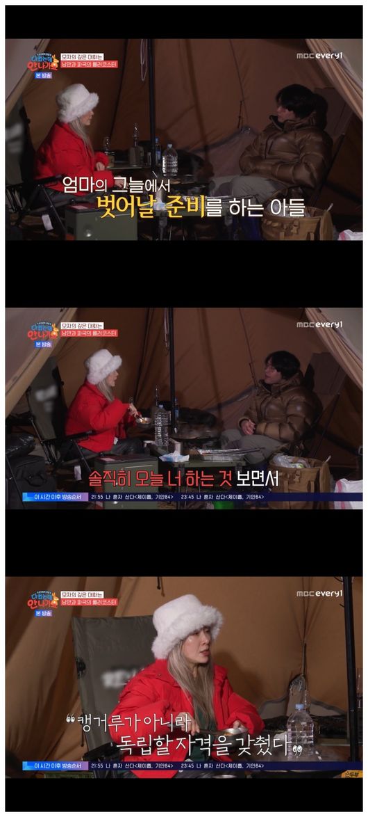 [OSEN=오세진기자]‘다컸는데안나가요’배우박해미가아들황성재와떠난여행에서우여곡절끝에진심을전했다.8일방영한MBCevery1MBN‘다컸는데안나가요’에서는박해미의아들황성재가마련한첫캠핑이등장했다.황성재는“엄마랑단둘이캠핑은처음인거같다”라면서“저의취미생활인캠핑용품이다.엄마눈에는많은건데,사실맞다.캠핑갔을때미칠것같은그맛을엄마한테보여주고싶었다.느긋한바람쐬기,밤하늘별보기등을해보고싶었다”라고말했다.그러나출발부터박해미의불만은대단했다.박해미는“난너무추워서걱정된다”라며질색했다.황성재는“오늘대신‘이딴거왜하냐’이런말금지다”라며몇가지금지조항을만들었다.물론박해미는아랑곳하지않았다.20만원을주고산황성재의텐트를본박해미는말업싱황성재의멱살을잡고흔들더니그대로뺨을찰싹때렸다.황성재는“원래라면방문닫고엄마를회피하는데,엄마랑첫캠핑이니까엄마랑안싸우고싶다는게첫번째였다”라며화를꾹꾹눌렀다.이어황성재는박해미를끌고서해안갯벌로조개를캐러갔다.문제는영하20도기후에눈발이날린다는것이었다.황성재는“어렸을때가족들이캠핑카를구매해서전국을돌아다녔다.서해안에서갯벌을간게강렬하게기억에남았다.그래서다시엄마랑가보고싶었다”라고말했다.또한황성재는박해미를위한캠핑음식으로김치&삼겹살구이,그리고다진마늘과대파를송송썰어넣은콩나물라면을끓였다.박해미는신이나서덩실덩실춤을추었다.황성재는“어렸을때부터일이잘풀리면단단하지않을수있다고하지않았냐.엄마품에만있어서엄마가더더욱그렇게보이지않을까한다”라며박해미에게숨겨온진심을전했다.박해미는“오늘이렇게하는걸보면서,캥거루가아니라독립할준비가됐다고생각한다.아쉽지만언젠가아들을떠나보내야할거같다”라며황성재를응원했다./[email protected][사진]MBCevery1MBN‘다컸는데안나가요’Copyright©OSEN.무단전재및재배포금지.