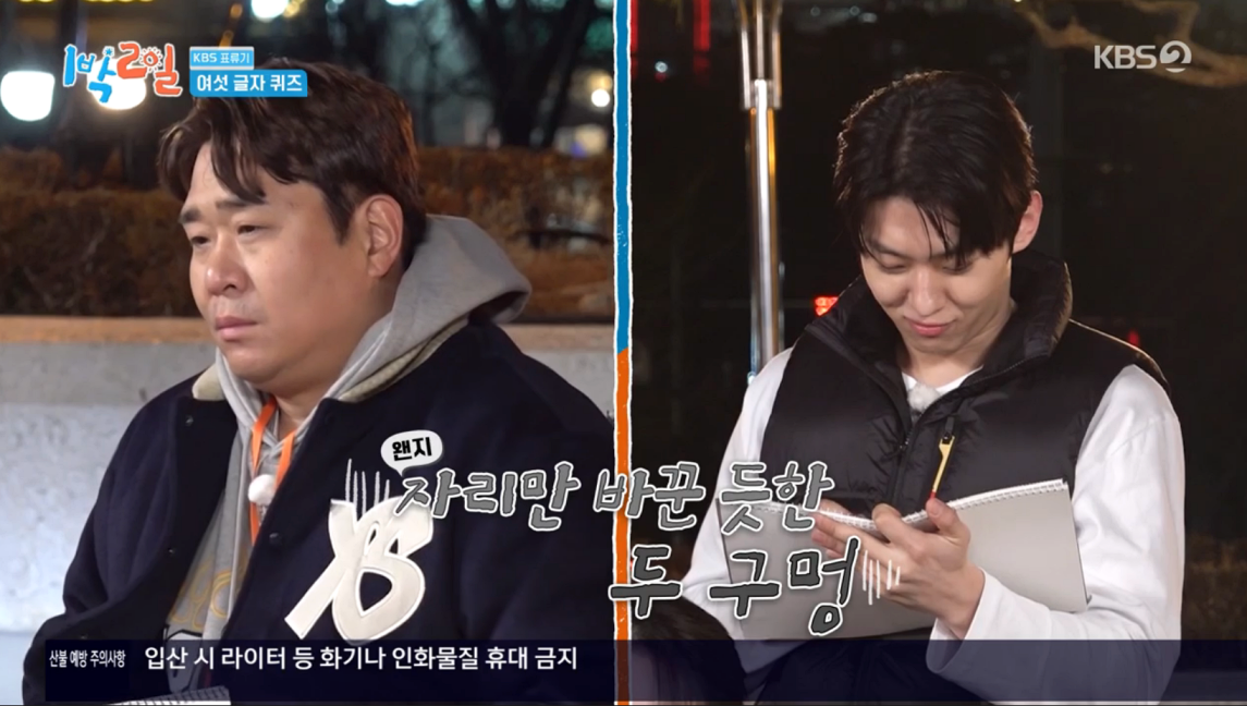 [OSEN=장우영기자]‘1박2일시즌4’강한나와덱스의활약이큰웃음을선사했다.23일방송된KBS2‘1박2일시즌4’에서는여섯멤버와단짝들이함께펼치는‘KBS표류기’두번째이야기가그려졌다.댄스신고식후두팀으로나뉘어저녁복불복이진행됐다.김종민·임우일,이준·강한나,조세호·남창희로이뤄진한나팀과문세윤·한해,딘딘·덱스,유선호·슈화로이뤄진슈화팀으로나눠진가운데팀구호와제스처를두고도팽팽한신경전이펼쳐졌다.메뉴로는멤버들이직접고른배달음식으로정해졌다.저녁메뉴인배달음식은승자팀이독식하기로했고,‘퀴즈탐험예능의세계’로게임이펼쳐졌다.배우조합을보고작품을맞히는1라운드인물·작품퀴즈는한나팀이6명연속정답을맞히며완승을거뒀다.덱스는음식을얻어먹고자한나팀에서임우일댄스를추기도해웃음을자아냈고,완패한슈화팀은내분이터지기도해불안감에휩싸였다.2라운드는6개의초성을보고한글자씩맞히는‘여섯글자퀴즈’로진행된가운데문세윤과덱스의헛발질로고생하던슈화팀이극적인승리를거두며승부를원점으로돌렸고,3라운드‘음악퀴즈’마저도거머쥐며저녁복불복승자가됐다.슈화팀은멤버들이직접고른최대배달음식메뉴로배를채웠다.아쉽게진한나팀은주먹밥으로끼니를해결한뒤구제미션을통해조세호와강한나,남창희가식사에합류했다.특히강한나는구제미션인철가방을직접돌리면서눈이뒤집힌모습을보여웃음을자아냈다.잠시쉬는시간에는게스트만족도평가가펼쳐졌다.덱스는“10점중에9점이다.다음에공포특집때꼭와보고싶다”고말했다.특히덱스는풀체험을하고싶다는뜻을밝히며‘1박2일’이방송계UDT라고평가했다.남창희는풀촬영을했다가8시간동안링거를맞았다고밝혔다.강한나는“텐션이점점오르고있다.MBTI가INFJ인데테크토닉춘건나를던진것”이라고말했고,슈화는“텐션이너무높아서힘들다”고혀를내둘렀다.잠자리복불복은대형세트에서펼쳐졌다.슈화팀(유선호·슈화,딘딘·덱스,김종민·임우일)과한나팀(강한나·이준,문세윤·한해,조세호·남창희)으로나뉘었고,‘1박대잔치’1라운드는간식볼불복으로진행됐다.멤버들중에서는간식복불복이처음인이준과조세호는겨자떡에서단단히매운맛을봤고,게스트중에서는호기롭게도전한덱스가까나리카노를바로뱉어내며복불복의쓴맛을봤다.반면슈화는까나리카노를맛보고도“괜찮다”고말해의아함을자아냈다.1라운드간식복불복은한나팀이승리한가운데2라운드는짝꿍베게싸움으로펼쳐졌다.첫번째대결에서유선호·슈화가승리한가운데딘딘·덱스와문세윤·한해가두번째대결에서맞붙었다.에이스끼리의맞대결로주목을모은가운데덱스의파워풀한펀치에베개가터지는사건이발생했다.‘1박2일’18년역사상볼수없었던광경속에서덱스와문세윤의대결이이어졌고,문세윤의묵직한펀치속에덱스가급소를맞고떨어져승부가원점으로돌아갔다.절체절명의순간에놓인슈화팀을구해낸김종민·임우일이었다.김종민과임우일이조세호·남창희를상대로승리하며잠자리복불복은점입가경으로흘러갔다./[email protected]©OSEN.무단전재및재배포금지.