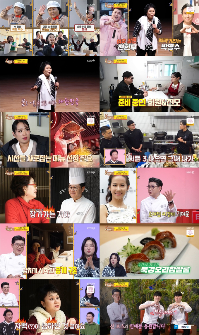 ‘사당귀’신종철결혼압박최고8.1%(사진:KBS)KBS2‘사장님귀는당나귀귀’의20년차돌싱신종철보스가절친선우용여,이경실에게결혼압박을받아웃음을자아냈다.지난9일(일)방송된KBS2예능‘사장님귀는당나귀귀’(연출안상은,이하‘사당귀’)296회는전국시청률5.0%,최고시청률8.1%,2049시청률1.6%로전채널동시간1위를이어갔다.이는145주연속기록이다.(닐슨코리아기준)이순실보스가통일메아리악단공연에서가수의꿈에한걸음다가갔다.이순실은박명수의‘바다의왕자’가사에맞춘구호와박수동작등각종리액션을전수,완벽한‘이순실응원조’를결성했다.이와함께소해금연주가박성진은자신의탈북이유에대해“당간부들의요청에‘칠갑산’을불렀다가40일이상감금됐다”며“북한예술대학교는손에장애가없고,외모가출중한학생이선발된다”며“악기를못다뤄도예쁘면아무문제가없다”고전했다.이에이순실이입학욕심을내자박성진은“가능은하다.그런데누이얼굴이커서튜바담당이될것”이라응수하자“일명돼지나팔이라고한다”며씁쓸한표정으로부연설명을하는이순실덕에폭소가터졌다.통일메아리악단의공연이시작되자토크무대에오른이순실은자신이준비한‘바다의왕자’무대와함께“대한민국은꿈을이룰수있는나라”라며“다음에는‘바다의왕자’풀버전을보여드리겠다”고다짐했다.정지선보스가김희원셰프의집을찾았다.청소여부,냉장고상태까지체크하며잔소리를늘어놓고는“요리를해주러왔다”며냉장고속재료로대만스타일곱창국수만들기에돌입했다.순식간에완성된곱창국수를맛본김희원이“아팠던게싹나은느낌”이라며깨끗하게그릇을비워정지선을뿌듯하게만들었다.그제서야정지선은“나몰래요리서바이벌지원한다며?”라고묻자당황한김희원은박진모셰프도지원했다고폭로했다.김희원과함께박진모의매장을찾아간정지선은“왜나한테말안하냐”며서운함을내비치면서도제자들의지원서첨삭에나섰다.지원서한줄한줄지적을이어간정지선은성의없이찍은개인영상을본뒤더큰한숨을크게내쉬었다.“시선을사로잡는메뉴선정이필요하다.화려함과섬세함을포인트로집중받을수있는요리를생각해라”고조언했다.김희원과박진모둘중한명에게만자신의이름을지원서에쓸수있게해주겠다며“제대로해라”고주문한정지선.10년전정지선에게배웠던고양이귀면볶음과참돔튀김으로‘통생선먹은고양이’의박진모와연두부를얇게썬‘해물문사두부’를준비한김희원의모습에기대가고조됐고,정지선은“완성된요리의과정이나비주얼은꽝이지만맛은괜찮다”며디테일한조언을전했다.이어박진모의요리를정지선스타일로재해석해완벽한비주얼과맛으로제자들을감탄하게만들었다.이어“이번에는어려워보이니시즌3에나가라”는애정어린농담을던져폭소를안겼다.신종철보스가선우용여와이경실에게3월신메뉴평가를받았다.신종철은“선우용여어머니와이경실이선택한메뉴는시그니처로자리잡았다”며각별한사이임을강조했다.선우용여는돌싱20년차신종철에게결혼하라고조언했고,이상형을묻는전현무에게신종철은“예전에는유호정,요즘은조여정”이라고답하자이순실은“탈북민이3만5천명.어떤스타일이든다있다”는말로폭소를안겼다.에피타이저참치샌드,위스키로샤워한북경오리찹쌀롤에이어36시간끓인특제소스로풍미를더한양갈비가나왔지만작은사이즈가아쉬운이경실이“아동용이냐”고혹평했고,신종철을향해“안본사이에많이변했다.자뻑이심해졌다”며“소스만36시간끓이지말고여자에게도시간을쏟아라”면서결혼압박을이어갔고,마지막백화반과백육개장까지맛본선우용여는전부신메뉴로출시하라며합격점을줬지만,신종철에게는“올해는여자와교제하는거에중점을둬라”는말로웃음을안겼다.한편‘사장님귀는당나귀귀’는매주일요일오후4시40분KBS2TV에서방송된다.박지혜기자[email protected]뉴스연예팀기사제보[email protected]©bnt뉴스.무단전재,재배포및AI데이터활용금지