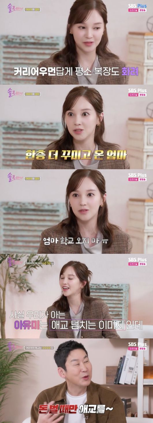 [OSEN=임혜영기자]아유미가애교넘치는이미지에대해비즈니스애교라고고백했다.11일방송된SBSPlus·E채널예능‘솔로라서’에는아유미가깜짝손님으로등장했다.아유미는“저희엄마는맞벌이셨다.항상화려하게다니셨던분이다.참관수업때엄마는한층꾸미고오셨다.향수뿌리고짧은바지입고.열쇠고리를엄청많이다셨다.멀리서차랑차랑"이라고과거를회상했다.이어"초등학생이니까창피하지않냐.우리엄마는날라리가오는것같은.그게너무창피해서오지말라고했다.지금생각하면오히려미안하다”라고말했다.아유미는가족끼리사랑한다는말을자주하지않았다면서자신의딸에게는사랑한다는말을많이하려고노력한다고했다.신동엽은아유미에게“애교가많아보이는데돈벌때만애교를”이라고농담을건넸고,아유미는“비즈니스애교다”라고쿨하게인정했다.또아유미는자신의딸이야기를하며“아들한테딸이라고하면예쁘다는것이다.얼마전에저는기사가났다.아들이라고.기자이름뭐냐고”라고말을했다./[email protected][사진]SBSPlus·E채널예능‘솔로라서’Copyright©OSEN.무단전재및재배포금지.