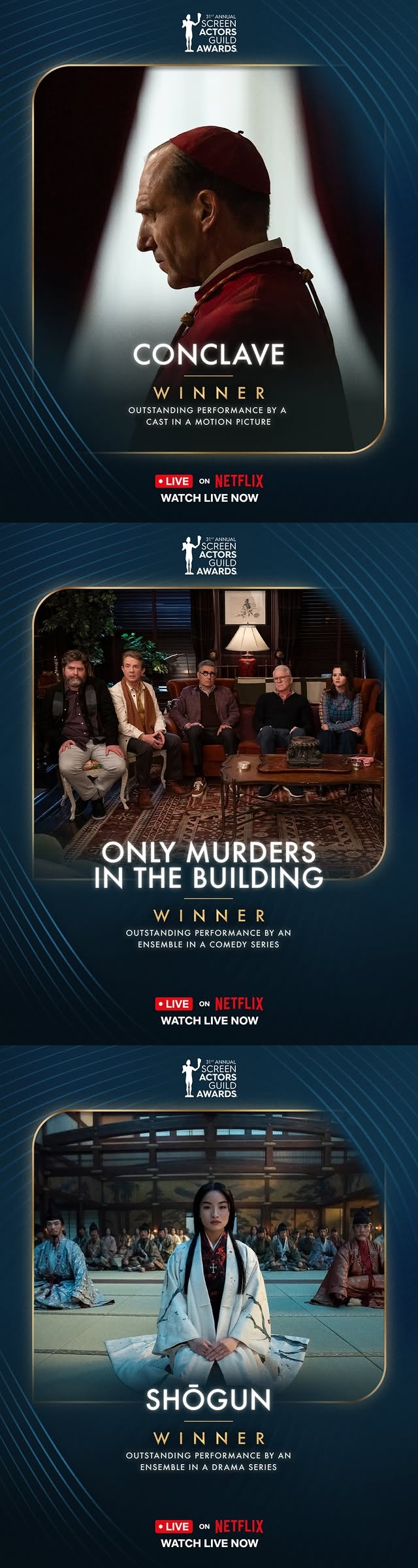영화'콘클라베',코미디시리즈'아파트이웃들이수상해',드라마시리즈'쇼군'이제31회미국배우조합상(SAG)에서최고상인앙상블상을수상했다.iMBC연예뉴스사진제31회미국배우조합상이23일(이하현지시간)미국로스앤젤레스에서개최됐다.미국배우조합상은골든글로브,영국아카데미시상식(BAFTA)과더불어아카데미시상식(오스카)의전초전으로불리는3대상중하나로,영화및TV시리즈부문에서총15개부문에대한상이수여된다.시상식최고상은앙상블상이다.먼저영화부문에선스릴러영화'콘클라베'가최고상수상의영예를안았다.'아노라''컴플리트언노운''에밀리아페레즈''위키드'등쟁쟁한작품들을꺾고앙상블상을수상한'콘클라베'는앞서지난주열린BAFTA에서도작품상,영국작품상,각색상,편집상등을차지하며4관왕에올랐던바다.내달예정된아카데미시상식에서는작품상,남우주연상(레이프파인스),여우조연상(이사벨라로셀리니),각색상,음악상,의상상,편집상,미술상등8개부문후보에올라있다.코미디시리즈부문에선'아파트이웃들이수상해'가앙상블상의주인공이됐다.'아파트이웃들이수상해'는뉴욕의한아파트에서벌어진의문의살인사건의범인을쫓는비공식탐정3인방찰스,올리버,메이블의못말리는코믹수사극.지난해8월디즈니+를통해시즌4가공개됐다.마지막으로드라마시리즈부문에선'쇼군'이수상하며트로피를하나더추가했다.'쇼군'은이미제76회프라임타임에미상시상식드라마시리즈부문작품상,제82회골든글로브시상식드라마부문최우수작품상을석권했었는데이번엔미국배우조합상에서도수상의기쁨을누리게됐다.iMBC연예김종은|사진출처SAGCopyright©MBC연예.무단전재및재배포,AI학습금지.