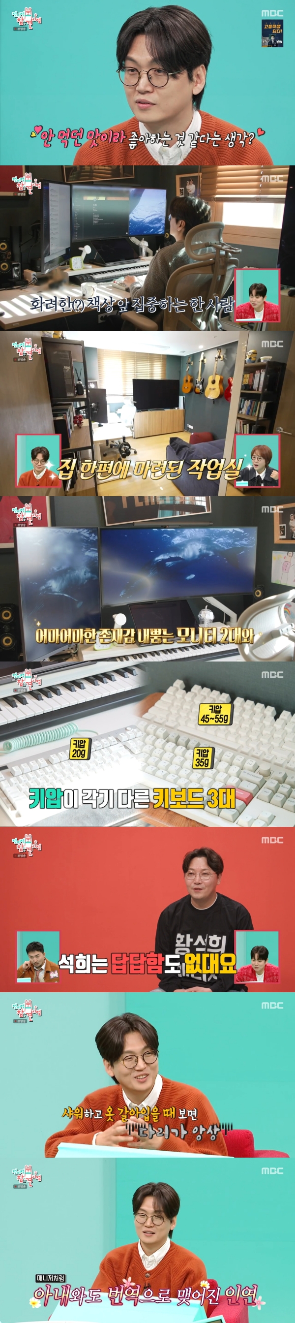 사진=MBC[스포츠투데이김태형기자]영화번역가황석희가일상을공개했다.22일방송된MBC'전지적참견시점'에는번역가황석희의일상이그려졌다.이날황석희의집이공개됐다.햇빛이잘드는방에그의작업실이있었고,액자에는딸을안고있는황석희의사진이담겼다.또한벽에는기타가걸려있었다.특히눈길을끈것은어마어마한크기의모니터2대와키압이서로다른키보드3대였다.황석희는"키압이나느낌,소리가다다르다.손가락이아픈날에는키압이약한키보드를쓴다"고설명했다.그의매니저오종현은"황석희와20년된친구사이다.저는(번역일을)2003년부터시작했다.번역경력으로치면23년차"라고인사했다.황석희는"지금은회사대표다.번역가들은대부분프리랜서라이회사에서같이일하는번역가가100명정도된다"고밝혔다.특히"영상물번역가중에는남자가없다"며"어림잡아서100명중2명정도가남자"라고해눈길을끌었다.이에전현무는"저도대학교다닐때살짝통번역학원다닌적있다.저만남자였다"고부연했다.오종현은황석희에대해"진짜집돌이다.한번집에박혀있으면나오질않는다.집안에작업실이있어서번역가특성상집에있는경우가많은데그렇게작업하다보면답답할것같은데밖에잘나가지않고씻지도않는다.석희는그게심한것같다"고제보했다.이에황석희는"마감이빡빡하면3~4일동안아예집밖에안나간적도많다.그런일이많다보니까그렇게오랫동안안나가고샤워하고옷갈아입을때보면다리가앙상해져있다"고고백했다.또한"아내도저와같은번역일을한다.제가한창활동할때제블로그찾아와서안부글남겼다.'안녕하세요번역가님.번역가를꿈꾸는대학생입니다'그랬다가잘됐다"며"아내는더빙번역쪽에스페셜리스트고저는자막쪽이다.디즈니애니메이션이나실사화영화더빙된걸보면아내의작업물을보셨을가능성이크다"고밝혔다.[스포츠투데이김태형기자[email protected]]Copyright©스포츠투데이.무단전재및재배포금지.