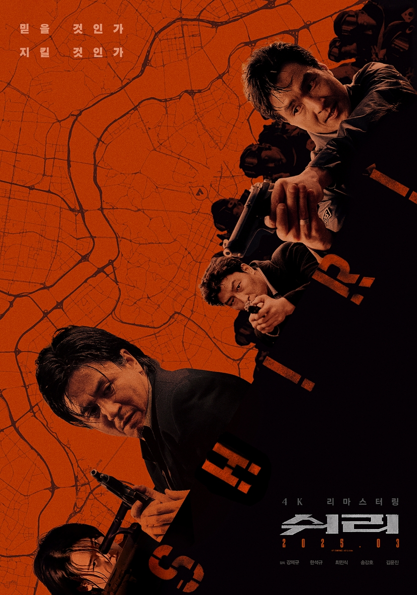 영화'쉬리'재개봉기념포스터[CJENM제공.재판매및DB금지](서울=연합뉴스)오보람기자=강제규감독의영화'쉬리'가4K화질로리마스터링돼오는19일재개봉한다고배급사CJENM이6일밝혔다.1999년개봉한이영화는국가일급비밀정보기관특수요원유중원(한석규분)과이장길(송강호)이북한군대장박무영(최민식)과남파간첩,내부첩자에맞서벌이는숨막히는첩보전을담은작품이다.김윤진은유중원의연인이자미스터리한인물이명현역을소화했다.'쉬리'는약620만명의관객을동원하며당시기준역대가장흥행한한국영화로기록됐다.대규모자본을투입하고실감나는총기액션,서울잠실주경기장로케이션촬영등을시도해한국영화최초의블록버스터로꼽힌다.제35회백상예술대상에서영화부문대상,작품상,감독상,남자최우수연기상(최민식)을받았고제20회청룡영화상에서는감독상을가져가며호평받았다[email protected]▶제보는카톡okjeboCopyright©연합뉴스.무단전재-재배포,AI학습및활용금지