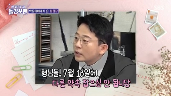 (엑스포츠뉴스오수정기자)'돌싱포맨'에서김준호가청첩장을건넸다.11일방송된SBS예능프로그램'신발벗고돌싱포맨'은'덕보러왔습니다'특집으로꾸며져배우이종혁,유선,김윤지,윤현민이출연해이야기를나눴다.이날김준호는'돌싱포맨'형들에게"7월13일에다른약속잡으면안된다"면서청첩장을건넸다.이에이상민은"근데결혼식장계약금이없어서이혼을할뻔했다더라.돈이없어서준호가도망을가고지민이가돈을냈다고?"라고물었고,김준호는"계약하는날돈을내는건줄몰랐다"고어느정도는인정(?)해웃음을줬다.특히이상민은"너가직접계약을했으면2번을하는거니까할인을해줬을텐데"라고놀려웃음을자아냈다.사진=SBS방송화면오수정기자[email protected]©엑스포츠뉴스.무단전재및재배포금지.
