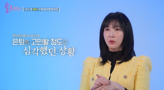 (엑스포츠뉴스김예나기자)배우이수경이피부문제로은퇴를고민했다고털어놨다.18일방송된SBSPlus·E채널예능'솔로라서'에서는이수경의일상이그려졌다.이날방송에서이수경은직접아로마테라피를능숙하게하는모습으로눈길을끌었다.이수경은아로마테라피를1년넘게배웠다면서"피부가예민하다.뒤집어져서한동안일을못했던적도있다"고털어놨다.당시심각해진피부상태로한동안일을쉬어야했다는이수경은"병원에서도원인을모르겠다고하더라.이제일을하면안되나싶을정도였다.많이힘들었다.우울증과대인기피증도같이찾아왔다"고떠올렸다.이어"일주일전에봤던사람들이'너갑자기왜이래'이러니까우울할수밖에없더라.회사문제도있고여러가지복합적으로오니까오래쉬게됐다"고덧붙였다.데뷔이후활발하게작품활동을이어온이수경은이로인해4년이라는긴공백기를갖게됐다.이수경은"살면서제가지금까지해온것은이것뿐인데평생이렇다면직업을바꿔야할수도있는것아닌가.여러생각이많이들었다"고밝혔다.당시사람들과마주할수가없어서숨어지냈다고.홀로조용히다양한자격증을받으며미래를위한준비를이어왔다는이수경은어느순간기적적으로피부가회복됐다고했다.그는"다낫기까지한2년은걸렸다.그래도다필요한시기였겠죠?"라고담담하게말하며미소지었다.이수경은증상이괜찮아진계기를두고마음의변화라고했다.그는"예전에는쉬는날에도일과가빡빡했다.그러다가마음이행복한게최고라는생각이들더라"면서마음을편하게먹게되면서행복을찾게됐다고밝혔다.사진=SBSPlus방송화면김예나기자[email protected]©엑스포츠뉴스.무단전재및재배포금지.