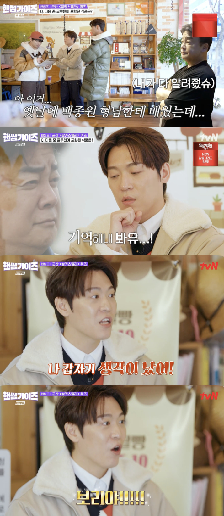 [스타뉴스|정은채기자]/사진='핸썸가이즈'방송화면캡쳐'핸썸가이즈'에서가수존박이백종원수제자면모를뽐냈다.9일방송된tvN예능프로그램'핸썸가이즈'14화에서는'전복빵지순례'를주제로레이스가펼쳐진가운데'핸썸즈'이이경,오상욱,존박과'가이즈'김동현,신승호,장혁이빙고의승패를겨루는치열한후반전을펼쳤다.이날핸썸즈팀은감자,메밀,보리,아몬드중'글루텐'이포함된식품을찾아내는문제를받았다.문제를받자마자존박은"바로정답을외칠까요?"라며강한자신감을보였다.이어그는"글루텐이찰기를만든다.감자도약간찰기가있다.메밀은잘끊어진다"라며유식함을뽐내는듯했다.그러나이내곧"보리가쌀아니냐"라고엉뚱한말을내뱉어팀원들의신뢰를잃었다.결국존박은"얘기하면서헷갈리기시작했다"라며"옛날에백종원형님한테글루텐레슨받았는데..."라고머리를싸매며괴로워해웃음을안겼다.그러다존박은"나갑자기생각났다.보리로맥주를만들지않냐.맥주에글루텐있다"라며글루텐이포함된식품인'보리'를정답으로맞히기에성공했다.정은채기자[email protected]©스타뉴스&starnewskorea.com,무단전재및재배포금지