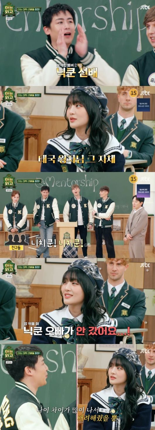 [OSEN=임혜영기자]닉쿤이태국연예인단체방에대해언급했다.4일방송된JTBC‘아는외고’에는외국인예능선배아유미,닉쿤,줄리안,파비앙이출연했다.닉쿤을본민니는“진짜태국왕자님이다.모르는사람이없다.닉쿤오빠이야기하면다니치쿤,니치쿤(한다)”라고태국에서의닉쿤의어마어마한인기를증언했다.민니는2PM팬이었냐는말에슈퍼주니어팬이었다고말해웃음을자아냈다.붐은태국연예인단체방이있냐고물으면서닉쿤이그방을나간게맞는지물었다.닉쿤은그방을알고있었다고말하면서자신은그단체방에들어가있지않았다고말했다.출연자들은닉쿤,민니,뱀뱀,리사등태국출신연예인들이모여서밥을먹으면라인업이어마어마할것이라고놀라워했고민니는“밥먹으러갈때닉쿤오빠가안갔다”라고불화설을불러일으켰다.결국닉쿤은나이차이가많아서배려한것이라고해명했다.사쿠라는“카드만줘도(괜찮지않냐)”라고첨언했고붐은“카드를줄수있는데후배들이워낙잘버니까”라고닉쿤을감싸웃음을자아냈다./[email protected][사진]JTBC‘아는외고’Copyright©OSEN.무단전재및재배포금지.