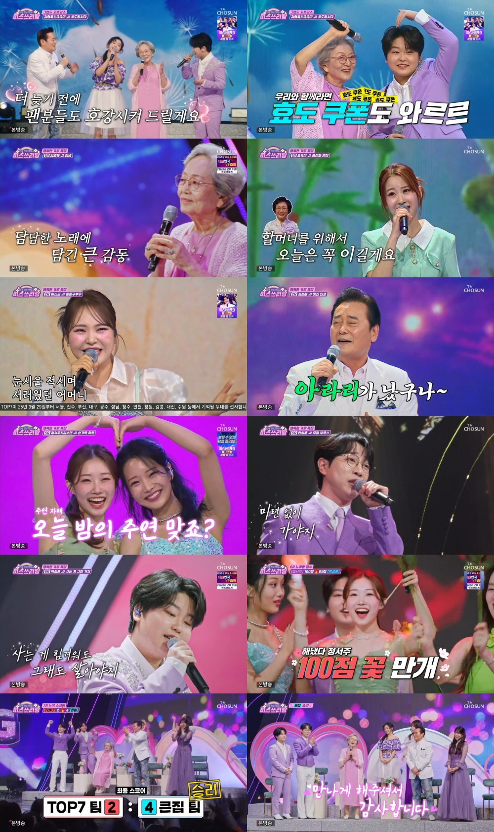 TVCHOSUN‘미스쓰리랑’‘미스쓰리랑’정서주가안성훈과박성온을상대로완벽히승리했다.3월19일방송된TVCHOSUN‘미스쓰리랑’은‘행복한가(家)’특집으로꾸며졌다.‘국민할머니’김영옥,‘국민아버지’김성환,‘국민며느릿감’요요미,‘국민막둥이’박성온이스페셜게스트로출격해TOP7과박빙의노래대결을벌였다.이날방송은닐슨코리아전국기준시청률4.3%를기록하며전주대비상승한시청률을나타냈다.이는지상파-종편-케이블포함동시간대전채널1위,일일종편프로그램전체1위에해당하는수치다.순간시청률은4.7%까지치솟았다.국민가족들과함께한초특급효도대잔치가TV앞시청자들의마음을확실히사로잡은특집이었다.1라운드에서는김영옥대미(美)오유진,세대를아우르는트롯대결이펼쳐졌다.김영옥은오유진을향해“자네점수가그렇게좋진않더라.오늘은꼭날이겨봐”라며원조‘할미넴’다운기세를보였다.이어김영옥은조항조의‘정녕’으로한편의드라마같은무대를선보여오유진을긴장하게했다.이에맞선오유진은현철의‘봉선화연정’으로간드러진보이스를과시했다.김영옥과오유진은나란히98점동점을기록하며우열을가릴수없는노래대결의시작을알렸다.‘전라도의아버지’김성환과‘전라도의딸’TOP7미스김이2라운드에서맞붙었다.두사람은본격적인대결에앞서판소리‘사철가’의한구절을읊으며한서린구슬픈성량을뽐내기대감을더욱증폭시켰다.결과는박정식의‘멋진인생’을선보인김성환의승리였다.리허설무대에서100점을기록했다던미스김은특유의구수한트롯창법으로방어진의‘동동구루무’를열창했음에도,본무대에서는95점을받으며패배해안타까움을자아냈다.‘미스트롯2’진(眞)양지은과‘미스트롯3’선(善)배아현의대결이성사돼눈길을끌었다.선공의양지은은나훈아‘어매’로절절한감성을담아내며감동을유발,98점의고득점을기록했다.무대를본김영옥은“이게노래지.더할말이없네”하며최고의극찬을보냈다.배아현은백설희의‘봄날은간다’로정통트롯의정수를선보였다.배아현의무대끝에도“100점나올것같다”,“대단한데스매치였다”,“축음기같다”등감격의찬사들이쏟아졌다.앞선대결에서배아현에게패배했던양지은은96점을기록한배아현을2점차로꺾고설욕의승리를거뒀다.‘미스터트롯2’진안성훈을잡기위해‘미스트롯3’진정서주와TOP7승률1위김소연이합을맞췄다.‘영혼의단짝’으로불리는정서주X김소연듀오는노지훈‘손가락하트’를능숙한퍼포먼스로소화해팬들을웃음짓게했다.반면강승모‘무정부르스’로웃음기싹뺀진지한무대를선보인안성훈은96점을받는데그쳐패배했다.정서주는박성온과의대결에서100점승리를거두며또한번진의위엄을자랑했다.박성온은장민호의‘사는게그런거지’로어른들의감성을촉촉이물들였고,99점의고득점으로무대를끝마쳤다.승리를향해서는오직100점만허용된상황.정서주는김용임‘꽃바람’으로독보적음색과감성을자랑하며최고점100점을기록했다.정서주의무대에푹빠져든김영옥은“우리가졌어도기분좋다”라며벅찬소감을전했다.마지막7라운드까지쉴새없이달려온이날대결의승리는게스트‘큰집’팀의4대2승리로마무리됐다.과연다음주에는어떤무대와게스트들이찾아올지.TVCHOSUN‘미스쓰리랑’은매주수요일밤10시시청자와만난다.안병길기자[email protected]©스포츠경향.무단전재및재배포금지.