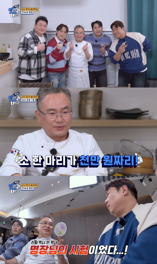 [OSEN=강서정기자]‘THE맛있는녀석들’이한마리에천만원하는소고기먹방을펼친다.7일방송되는코미디TV‘THE맛있는녀석들’에서는지난주에이은삼시몇끼특집으로,흑백요리사셰프들이출연해멤버들의저녁과야식을책임진다.첫번째등장한셰프는안유성명장으로남도초밥7종과업그레이드된상추튀김텐동,마무리로미니평양냉면까지준비하며풀코스디너를선보인다.이날안유성셰프는한마리에천만원하는소고기를준비해제작진을깜짝놀라게한다.안유성셰프는요리재료를공개하며“뒷박살(우둔살)과토시살이다.아침에도축할수있는유일한소고기를먹는것이다”라고말해궁금증을안긴다.또죽은피조개를손끝터치하나로살아나게만드는신기한기술까지선보여감탄을모은다.뿐만아니라한입만멤버를위한즉석요리로모든재료를모두섞어만든지라시스시를선보인다.이에촬영내내속상한모습을보였던한입만멤버는50인치허리까지꺾어가며야무지게먹는모습으로배려를보답한다.한편,안유성명장은진짜한입만멤버가안먹는지궁금했다며제작진을시험해폭소를안긴다./[email protected][사진]코미디TV제공Copyright©OSEN.무단전재및재배포금지.
