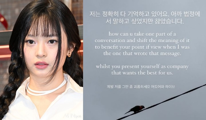 CCTV·카톡공개한어도어주장반박(MHN스포츠이윤비기자)민희진전대표가'무시해'사건을키웠다는어도어의주장에대해그룹뉴진스(NJZ)하니가직접반박에나섰다.7일하니는NJZ공식SNS를통해"저는정확히다기억하고있다.아까법정에서말하고싶었지만참았다"며"제발저를그만좀괴롭혀라.어도어와하이브"라고전했다.이는어도어의하니'무시해'발언이민희진전어도어대표이사에게서나왔다는주장에대한반박으로'무시해'발언을들은것이사실이라는취지로보인다.어도어측은7일진행된'기획사지위보전과광고계약체결금지가처분'사건의첫심문기일에서"아일릿멤버들이하니에게90도로인사하는장면이찍혀있다"며사건당일영상을공개했다.이어"CCTV영상은음성녹음기능이없어무시해라는발언이있었다는주장은확인불가능하다"고덧붙였다.또한민전대표이사와하니가나눈카카오톡메신저대화내역도공개했다.메시지내용에서하니는민전대표에게"네분이스타일링방에서나왔는데그쪽매니저님이그냥모른척하고지나가라고말하신걸들었다"고당시상황을설명했다.그러면서도"정확히그단어들이었는지기억은없고그냥대충그런말이었다"고했다.민전대표는"무시해,이거?""모두가너를무시한거니?""니인사받지말라고매니저가시킨거?"라며여러차례질문했다.어도어측은이를근거로"하니본인도크게문제삼을일이아니라고이야기한사안을민전대표가무시해로사건을키웠다"라고주장했다.이에하니는"어떻게당신들은우리를위해최선을다하는것처럼스스로를포장하면서도당신들의관점을더유리하게만들기위해대화의한부분만을가져가서의미를바꿀수가있냐"라며비난했다.한편,어도어와뉴진스는전속계약에대한법적공방을이어가고있다.이날심문기일에뉴진스멤버들은이례적으로전원이참석했다.해린은"믿음과신뢰가무너진회사와일을하는것을어려울것같다"고했으며,다니엘은"어떤결과가나오든어도어와함께하고싶은마음이없다"고강조했다.어도어와뉴진스의전속계약유효확인소송첫변론기일은오는4월3일로예정됐다.사진=MHN스포츠DB,NJZSNSCopyright©MHN스포츠.무단전재및재배포금지.