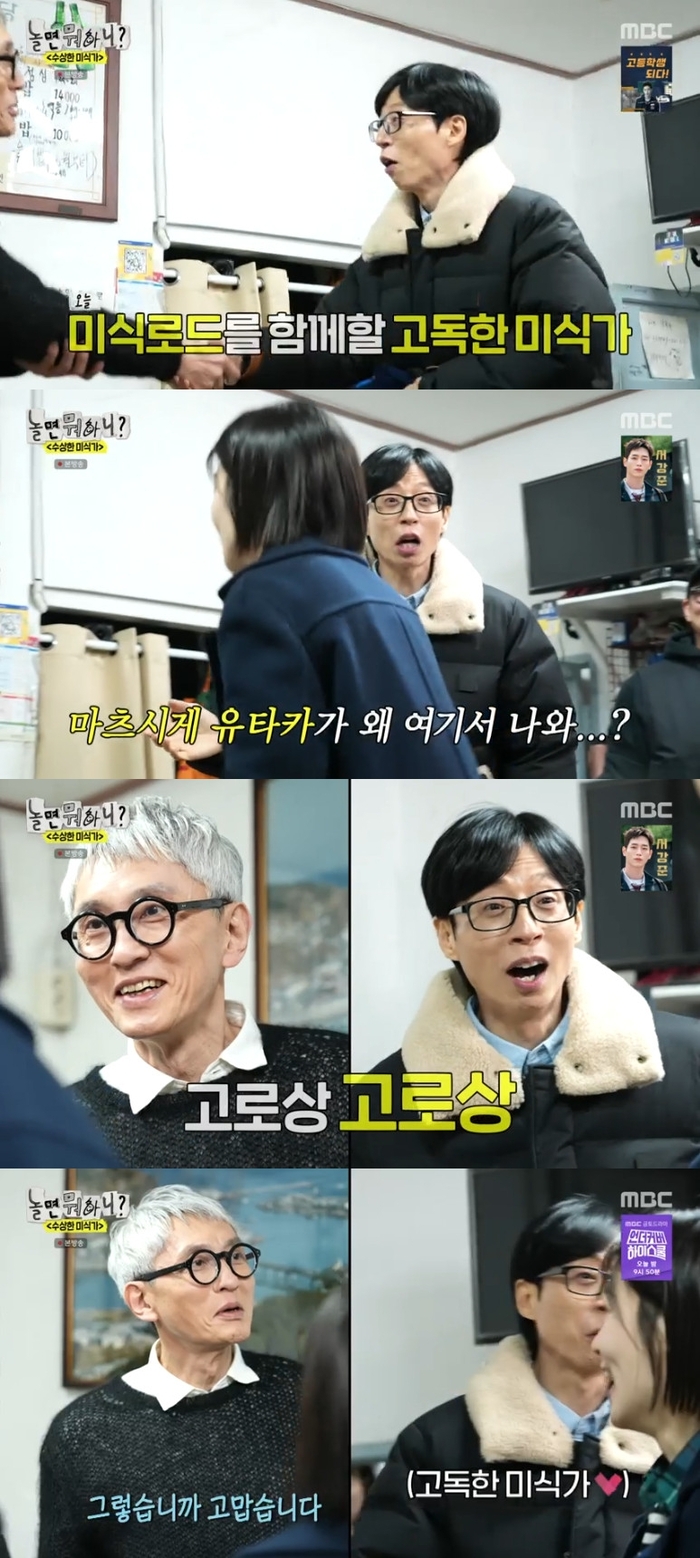 ‘놀면뭐하니’.사진IMBC유재석이‘고독한미식가’고로상으로유명세를펼친마츠시게유타카를보고놀랐다.22일오후방송된MBC예능프로그램‘놀면뭐하니?’(연출김진용장우성장효종왕종석,작가최혜정)에는과메기식당에서마츠시게유타카를만난유재석,이이경,심은경이모습을보였다.이날방송에서유재석과이이경은“여기과메기를잘하는미식전문가가있다고요?”라며심은경이이끄는식당으로향했다.식당에들어서자마자마츠시게유타카를본유재석은“어고로상!어유안녕하세요!”라며매우놀랐다.그는“고로상!아잇너무반가워요...나너무팬인데...고독한미식가는정말...우리에게는!”이라며말을잇지못했다.MBC‘놀면뭐하니?’는매주토요일오후6시30분방송된다.[서예지스타투데이객원기자]Copyright©스타투데이.무단전재,재배포및AI학습이용금지