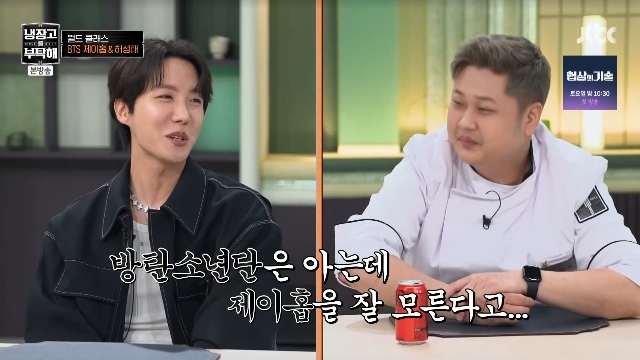 냉장고를부탁해방탄소년단BTS제이홉/사진=JTBC[스포츠투데이서지현기자]'냉장고를부탁해since2014'제이홉이인지도굴욕을당했다.2일밤방송된JTBC'냉장고를부탁해since2014'에서는배우허성태와그룹방탄소년단(BTS)제이홉이출연했다.이날제이홉이등장하자윤남노셰프는"제가욕을너무많이먹었다"고안절부절못했다.이에대해제이홉은"제가'흑백요리사'가핫해서보다보니까윤남노셰프님매력에빠졌다.SNS에포스팅을했었다"며"근데다른방송에서'BTS는아는데제이홉은잘모른다'고하시더라"고폭로했다.이어제이홉은"홍보를하러나와야겠더라.제이홉이누군지를"이라고열정을드러냈다.이를들은윤남노셰프는"사실은집에TV가없다.세탁기하나정도만있다.잠만잔다"고해명했다.그러나김풍셰프가"핸드폰도있잖아"라고말하자윤남노셰프는"이번만큼은한번만도와주세요"라고애원했다.그럼에도최현석셰프는"핑계다.집에선풍기만있어도제이홉은안다"고일침을가했다.[스포츠투데이서지현기자[email protected]]Copyright©스포츠투데이.무단전재및재배포금지.