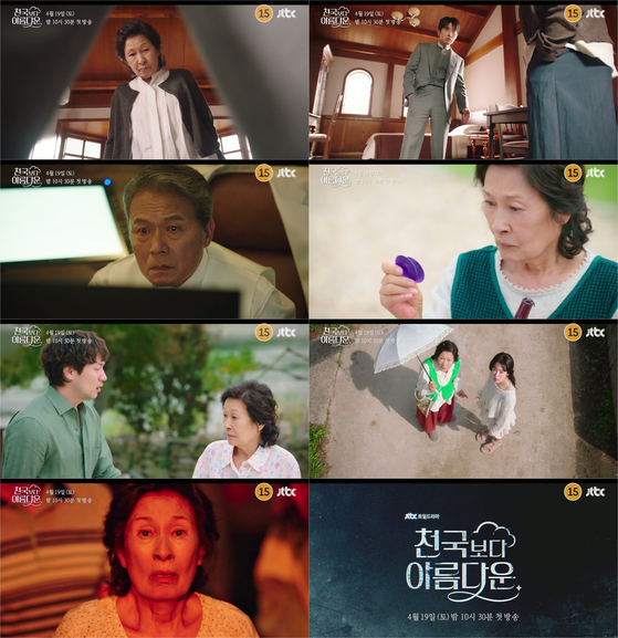 '천국보다아름다운''천국보다아름다운'김혜자가천국을발칵뒤집는다.4월19일오후10시30분에첫방송되는JTBC새주말극'천국보다아름다운'측은18일천국에서악동본능을일깨운김혜자(이해숙)의위태로운천국적응기가담긴3차티저영상을공개했다.'천국보다아름다운'은80세모습으로천국에도착한김혜자가30대모습으로젊어진남편손석구(고낙준)와재회하면서벌어지는현생초월로맨스극이다.죽음이라는인생의끝에서제2의삶을시작하는김혜자의천국라이프가유쾌한웃음과따뜻한감동을선사한다.무엇보다많은이들의인생드라마로손꼽히는'눈이부시게'에이어또하나의인생작탄생을예고한김석윤감독과이남규·김수진작가가재회했다.여기에김석윤감독과다시한번호흡을맞추는김혜자,손석구,한지민,이정은,천호진,그리고류덕환이합류해기대감을높였다.그런가운데공개된3차티저영상은'신입주민이해숙,천국을뒤집어놓다'라는문구와함께센터장천호진에게요주의인물로찍힌김혜자의천국생활을포착해눈길을끈다.회개를위해찾은교회에서목사류덕환에게삐딱한포즈를가르치는가하면,모든기억을잃은순수한영혼한지민(솜이)은언제보고배웠는지이미이해숙화된모습으로웃음을자아낸다."천국이예전보다재미있어진것같죠?꽤많은변화들이이해숙님으로부터시작된것같은데"라는센터장천호진의다정하지만의미심장한한마디에김혜자는자신이천국에잘못온것은아닌지스스로에게의심을품기도한다.하지만센터장천호진의관리감찰에도남다른행실이계속되던어느날갑자기김혜자의머리위로의문의포도알이떨어지기시작한다.'포도알하나만더받으면진짜지옥에가게될것'이라는목사류덕환의경고와남편손석구의당부도무시한대가로,기어코마지막포도알이하늘에서떨어지자마자김혜자역시천국이아닌또다른낯선곳에떨어진다.천국과달리어둡고음침한분위기속겁에질린사람들사이에파묻힌김혜자의긴장감가득한표정이그의위기를짐작게한다.과연김혜자는위기에서벗어날수있을까.'천국보다아름다운'은'협상의기술'후속으로만나볼수있다.황소영엔터뉴스팀기자[email protected](콘텐트비즈니스본부)Copyright©JTBC.무단전재및재배포금지.