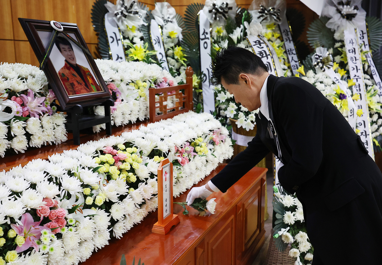 故송대관눈물의영결식“따뜻한미소기억할것”9일서울종로구서울대병원장례식장에서열린가수송대관의영결식에서태진아가헌화하고있다.[연합][헤럴드경제=고승희기자]“꿈을안고왔단다.내가왔단다.쨍하고해뜰날돌아온단다….”겨울햇살이화창하던날,50여년의긴세월동안희망을노래하던고(故)송대관이떠났다.9일가요계에따르면이날오전9시30분께서울종로구에위치한서울대병원장례식장에서고인의영결식이엄수됐다.유족과동료70여명이참석한영결식은고인을향한묵념과배우겸가수김성환의약력소개로시작됐다.이자연대한가수협회장은조사를통해고인의히트곡인‘네박자’의제목을고인과의일화를들려줬다.그는“‘네박자’가방송에나올때마다특히정이가고노래에한몫했다고생각해행복했다”며“우리후배들은선배님의유머있는모습과따뜻한미소와주옥같은노래들을잊지않고오래기억할것”이라고말했다.고인과는가요계의대표라이벌이자절친한동료였던가수태진아는“형님은항상저에게멘토였다.‘형가는길만따라오면된다’고하길래정말따라갔다”며“지난3일동안밥을안먹고술로배를채웠다.형님이하늘나라가서사시면제가방송하는것도큰재미가없을것같다”며애틋한마음을전했다.이어“치매를앓는제아내가대관이형을기억하는모습을보며아내를끌어안고울었다.대관이형이그만큼우리하고가깝게지냈으니기억해주는구나싶었다”며“대관이형잘가.영원한나의라이벌이여”라고인사했다.가수송대관의유가족이9일서울종로구서울대병원장례식장에서영정을들고이동하고있다.[공동취재]송대관태진아와함께트로트4대천왕으로함시대를풍미한설운도는“가수는결국무대에서시작해무대에서생을마감한다”며“마지막까지무대에서하고싶은일을웃으면서하시다가셨기에마음은아프지만위안이된다.형님빈자리를사랑으로채워주기를바란다”고애도했다.늘긍정을노래하며서민들을위로하던가수답게그의영결식의조가는‘해뜰날’이었다.태진아설운도를비롯한동료들이함께이곡을불렀고,김수찬은고인의성대모사로웃음과눈물을함께안겼다.송대관은지난7일심장마비로갑작스럽게세상을떠났다.장례기간태진아,설운도,하춘화,현숙,김흥국등동료가수와박지원더불어민주당의원이빈소를찾아고인이가는길을함께했다.더불어민주당박지원의원도빈소를찾아조문했다.박의원은고인이1980년대미국에서이민생활을하던시절부터막역한사이로지낸박지원의원은“송대관씨는저와형제처럼지내며제가어려울때,필요할때늘도움을줬다”며“훌륭한가수가너무빨리가서애석함이끝이없다.좋은나라로가셨으면좋겠다”고애도했다.가수강진은“송대관선배는이웃집형님처럼편하고친근한가수였다”며“돌아가셨다는소식을듣고믿기지않아달려왔는데이제아프지마시고좋은곳에서편히쉬시길바란다”고말했다.하춘화는“아직젊으신데갑자기이런일을겪으니까믿어지지않는다”며“굉장히마음이허전하고가요계가텅비어있는느낌이들어서너무슬프다”고말했다.송대관은1967년‘인정많은아저씨’로데뷔해‘해뜰날’,‘유행가’,‘네박자’등다수의히트곡을발표했다.경제가발전하던시기서민의마음을대변하는노래로희망을안겼다.1990년대엔태진아,설운도,고(故)현철과함께‘트로트사대천왕’으로도불리며트로트장르확산에기여했다.고인은경기도안성유토피아추모관에서영면에든다.Copyright©헤럴드경제.무단전재및재배포금지.