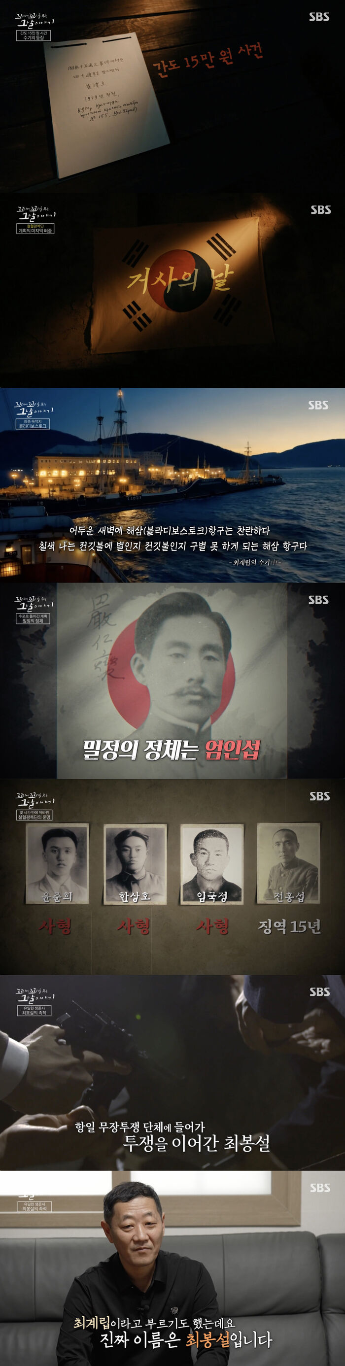 [SBS연예뉴스|김효정에디터]간도15만원사건과최계립을조명했다.27일방송된SBS'꼬리에꼬리를무는그날이야기'(이하'꼬꼬무')에서는1920년에일어난역사상가장치열하고긴박한독립운동의그날을추적했다.1994년7월,러시아연해주독립운동사적지를탐방하던학자들.1990년한국과러시아국교수교로독립운동의성지블라디보스토크는1992년에민간에개방되었고이에학자들은그곳으로향했던것.그리고이들은우연히한버스기사를만났고그에게서뜻밖의인물에대한이야기를들었다.그인물은만주와러시아지역에서독립운동한대표적인물인최계립.최계립은홍범도,김좌진장군급이라고말해도과언이아닌독립운동에있어서대단한지위의오른인물이었다.건국훈장중세번째로높은독립장을받은인물이기도했던그가바로자신의아버지라는것.이에학자들은증거를요구했고다음날버스기사는"간도15만원사건에대한40주년을맞으면서"라는제목의최계립이직접쓴41장짜리수기를가지고왔다.일제강점기일본에엄청난충격을안긴독립군의비밀작전이자해외독립운동역사상가장긴박했던사건중하나인간도15만원사건의수기가있다는것은처음접한이야기로교수는떨리는마음으로수기를확인했고역사의빈칸으로남아있던내용들이하나하나채워지는것을보고감탄했다.이는실제최계립의수기가맞았던것.1919년3월1일,만세운동의열기는국내를넘어해외까지번졌다.그리고총칼로우리민족을제압한일본에대해더이상맨손으로저항해서는안된다는마음이번졌다.그렇게조직된철혈광복단.독립비밀결사단체였던이곳은민족학교군사훈련받은출신들이만든것으로추정되며3.1운동전후독립운동을주도했다.무장후독립운동을하기위해돈이필요했던요원들.이들은일제에수탈된돈을찾기로마음먹었다.1919년9월,최봉설과윤준희는일제로부터돈을되찾을방법을모색했고조선은행용정지점직원전홍섭에게도움을요청했다.철도부설금이곧은행으로올것이라는계획을들은단원들.이들은임국정한상호박웅세김준까지가세한6인의최정예요원을선발했고목숨을걸고호송대를덮치기로했다.은밀하게전달된서신으로거사의날이정해지고1920년1월4일,현금수송을준비하는호송대를급습했다.동량어구에진입한호송대를급습해돈을빼앗은단원들.궤짝을가득채운돈은무려총15만원으로이돈의현재의가치150억가량으로추정되었다.이는총과탄환4천세트살수있는돈이었다.무기를사러블라디보스토크로향한철혈광복단은일본인들의눈을피해독립운동의성지신한촌으로입성했다.그리고같은시각전홍섭은내부자로의심받으며고문을당했다.그러나그는끝까지이야기하지않았고이에철혈광복단은무사히블라디보스토크로들어가게된것.무기구입전환전이반드시필요한상황에서이들은안중근의의형제이자3.1운동지도자로까지지명될정도의애국자로서알려진엄인섭과접촉해도움을받았다.그는안중근과단지동맹맺은의형제이자안중근과함께일본과싸운인물이었다.엄인섭을만나러간임국정은수일이지난후엄인섭과함께돌아왔고자신들의계획이무사히진행중이라는사실을알렸다.그리고다음날무기구매를기다리며떨리는마음으로잠든단원들.하지만계획수행직전계획이들통나체포되고말았다.그과정에서최봉설은총상을입었음에도탈출했고나머지단원들은모두체포되었다.그리고이들이체포된이유는바로모두가신뢰했던인물엄인섭때문이었다.누구도의심하지않았던엄인섭은사실오랜시간활동한밀정이었던것.그는여러이유로변절해밀정이되어독립운동가들의체포에긴밀하게관여하고있었던것이다.잔혹한고문에시달린단원들은1년간이어진최종재판에서사형이확정되었고,이들은도운전홍섭도징역15년형이확정됐다.1921년8월,사형집행으로끝이난간도15만원사건.만약이들의계획이성공했다면역사는어떻게되었을까?이후최봉설은항일무장투쟁단체에들어가끝까지싸웠다.하지만1937년스탈린의한인강제이주정책으로우즈베키스탄으로떠나고가족과여생을보냈다.그리고마지막순간함께싸운동료들을기억하며생을마감했다.방송에서는최봉설의후손이직접카메라앞에등장했다.최봉설은바로최계립이라고부르기도한인물이었던것이다.사형당한최봉설은죽고다시일어나싸운다는의미로최계립으로개명한최봉설.그는수기를통해언젠가반드시승리할것이라다짐했고결국승리하였다.이에학자들은간도15만원사건이"민주적이고미래지향적인대한민국의건설을앞당기려고하는끊임없는노력의한점"이라며역사적으로엄청난대사건이자절대우리가잊어서는안될사건이라강조했다.오랜시간이지나1966년현충원에안치된단원들.그리고최봉설은가족들과마지막까지함께한카자흐스탄에잠들어있다.마지막으로방송은대한민국이있기까지음지에서목숨바쳐싸운영웅들이있다는것,그들의희생덕에지금의우리가있다는것을잊지말아야한다고강조해눈길을끌었다.Copyright©CopyrightⓒSBS.Allrightsreserved.무단전재,재배포및AI학습이용금지