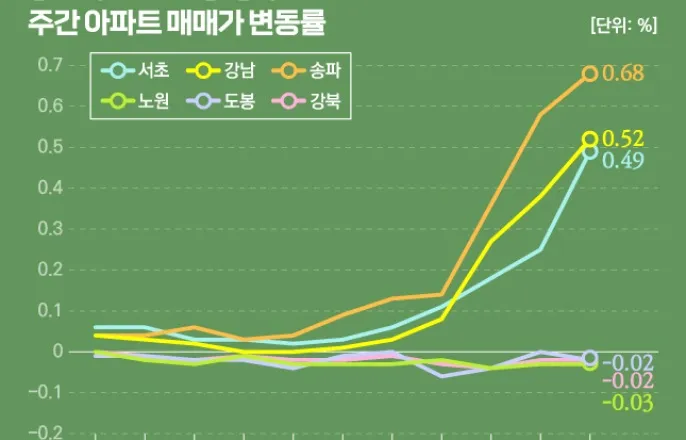 [집값톡톡]송파구주간0.67%↑강남3구이어마용성도상승노원구는11주연속하락지난달13일'토지거래허가구역(토허구역)'해제이후강남권일대의집값상승세가꺾이지않고있어요.여기에'마용성(마산·용산·성동구)'의집값상승도심상치가않아요.'토허구역'해제후폭풍이강남권밖으로까지번지는모양새에요.강남권이아닌곳에서도집값상승흐름이관찰되지만'노도강(노원·도봉·강북구)'은4주연속동반하락세에요.경기도에서도강남과가까운과천은가격이무섭게오르고있는반면평택과김포,광명등은내림세가두드러지는등지역별로가격흐름이천차만별이에요./그래픽=비즈워치강동·강남3구0.48%↑…노원구11주연속하락한국부동산원은3월첫째주(3일기준)서울주간아파트매매가격이0.14%상승했다고분석했어요.6주연속상승세를이어갔고상승폭도전주(0.11%)대비0.3%포인트확대했어요.재건축및주요선호단지에서는매도희망가격상승하고계약도체결되고있지만일부지역에서는매수관망세가나타나고있다는게한국부동산원의설명이에요.서울의집값상승은강남권이주도했어요.송파구는0.68%가오르면서지난2018년2월첫째주(0.76%)이후7년1개월만에최고상승률이에요.전주(0.58%)와비교해서는0.10%포인트높은상승률을보였어요.강남구도0.52%상승했는데이는6년6개월만에가장높은상승률이에요.서초구(0.49%)도매매가가전주대비크게상승했어요.강동구도고덕과상일동대단지등을위주로0.10%가올랐어요.강남3구와강동을포함한서울동남권은0.48%가올랐어요.지난해8월12일(0.50%)이후가장높은상승률이에요.강남권의집값상승흐름은'마용성'으로도이어졌어요.용산구는전주대비0.10%가올랐고성동구와마포구는각각0.08%,0.11%상승했어요.윤지해부동산R114수석연구원은"토지거래허가구역해제와기준금리인하등이매수심리를자극하고있고'똘똘한한채'선호현상도여전하다"면서"강남권과마용성에서는최고가를뛰어넘는기록들도다수확인되고있다"고말했어요.반면'노도강'은집값하락세가계속되고있어요.노원과도봉,강북구는2월둘째주(10일)조사부터약보합포함4주연속동반하락했어요.이번조사에서노원구는매매가가전주대비0.03%떨어졌고도봉과강북도0.02%떨어졌어요.특히노원은지난해12월16일약보합을포함해11주연속하락이에요.김은선직방빅데이터실랩장은"강남권에서고가주택의가격이오르며마용성도키맞추기양상을보이고있지만서울외곽지역까지가격이오르기에는수요자들의선호가뒷받침되지않고있다"면서노도강의집값흐름이반전되기는어려울것으로봤어요./그래픽=비즈워치과천0.51%상승,미분양평택은30주내림세서울이상승폭을확대하는사이전국단위의주간아파트매매가격은0.01%하락했어요.지난주(0.02%)와비교했을때는하락폭을축소했지만15주연속내림세에요.수도권은0.02%상승하며전주(0.01%)대비오름폭이커졌어요.다만이는강남3구의오름세가전체상승을주도한꼴이에요.경기도와인천은각각0.04%,0.03%하락했어요.마산·걸포동위주로가격이떨어진김포(-0.29%)와지난해10월'호반써밋그랜드에비뉴'부터12월'트리우스광명'등대규모신축공급이계속된광명(-0.19%)의하락률이두드러졌어요.평택도0.11%하락했어요.지난해8월5일(-0.07%)이후30주연속내림세요.특히평택은분양시장도좋지않아요.미분양이올해1월에만6438가구로전년동월(361가구)대비18배급증했어요.이에주택도시보증공사(HUG)가2020년5월이후4년10개월만에미분양관리지역으로지정했어요.미분양증가가빠르거나,미분양이계속해소되지않는지역이라는의미에요.반면수도권에서도강남과가까운과천은0.51%가올랐어요.재건축사업영향이있는별양·부림동위주로가격이상승했어요.이은형대한건설정책연구원연구위원은"경기도에서도서울강남권과가까운지역을중심으로는가격상승세가이어질것"이라면서"평택은경기도외곽지역인데다가반도체벨트에속해해당산업이침체하면가격이떨어질수밖에없다"고짚었어요.지방은(-0.05%→-0.04%)하락폭이작아졌지만40주연속하락세를벗어나지못했어요.대구(-0.10%)와부산(-0.05%),세종(-0.09%),제주도(-0.07%)도모두내림세를보였어요./그래픽=비즈워치전세시장도송파'존재감'전세시장은어떨까요.전국주간아파트전세가격지수변동률은0.01%로전주보합에서상승전환했어요.수도권(0.01→0.02%)은상승폭을확대했고서울(0.03%→0.03%)은유지했어요.지방(0.00%→0.00%)은보합세에서변동이없었어요.한국부동산원관계자는"서울일부외곽지역및구축에서매물가격이하향조정돼전세가격이하락했다"면서"다만정주여건양호한역세권및학군지등선호단지위주로상승계약이체결돼서울전체전셋값이올랐다"고설명했어요.서울에서전셋값상승률이가장높았던곳은송파구(0.11%)에요.강동구(0.06%)도고덕·둔촌동대단지위주로전셋값이올랐고요.양천구(0.05%)는목·신정동학군지위주,서대문구(0.04%)는북가좌·북아현동소형단지위주로전셋값이상승했어요.경기도(0.01%→0.02%)는매탄·영통동위주로가격이오른수원영통구(0.15%)와시흥시(0.10%),남양주시(0.10%)등의영향으로상승폭을확대했어요.반면광명시는대규모입주장영향에전셋값도0.30%떨어졌어요.정지수([email protected])ⓒ비즈니스워치의소중한저작물입니다.무단전재와재배