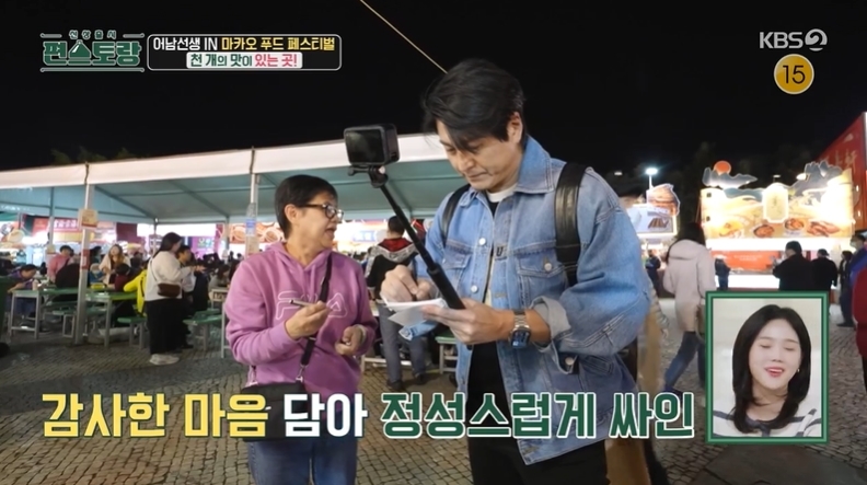 KBS2TV‘신상출시편스토랑’캡처KBS2TV‘신상출시편스토랑’캡처[뉴스엔김명미기자]류수영이마카오에서인기를자랑했다.2월28일방송된KBS2TV'신상출시편스토랑'(이하편스토랑)에서는글로벌K-푸드스타로떠오른어남선생류수영의마카오출장2일차가공개됐다.이날류수영은마카오푸드페스티벌현장을찾았다.벌써24회를맞은마카오푸드페스티벌은150개의엄선된음식부스들로구성,1,000여개이상의메뉴들이판매되고있는곳.세계각국에서미식가들이모이는초대형미식축제다.이런가운데한외국인팬이등장해류수영에게사인요청을했다.그는"당신을안다.부인(박하선)도알고,출연한'투윅스'도봤다"고말했다.이어외국인팬은"많은작품을봤다.'마지막춤은나와함께'도봤다"며20년전작품을언급했다.이에류수영은"감사하다"며자리에서폴짝뛰기까지했다.류수영은외국인팬에게사인을해주고,함께기념사진도촬영했다.이후로도수많은외국인팬들이류수영에게사진촬영을요구해눈길을끌었다.뉴스엔김명미mms2@기사제보및보도자료[email protected]ⓒ뉴스엔.무단전재&재배포금지Copyright©뉴스엔.무단전재및재배포금지.