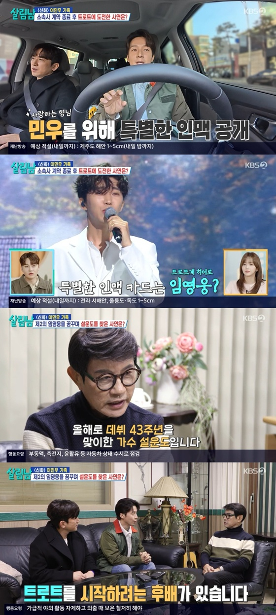 [스타뉴스|허지형기자]/사진=KBS2TV'살림남'캡처개그맨허경환이그룹신화멤버이민우에게특별인맥을소개했다.8일방송된KBS2TV예능'살림하는남자들'에는이민우와허경환이만나는모습이그려졌다.이날허경환은이민우에게"숨겨둔나의인맥카드를쓰겠다"고말했다.이에이민우는"임영웅씨카드없냐"고물었다.이에허경환은"임영웅씨는그냥팬이다.예전에방송에서만났을때친하게지낼걸그랬다.임영웅도이분앞에서는긴장하는그정도의분을섭외했다"고답했다.허경환의특별인맥은바로설운도였다.그는"감사하게도아이돌후배들이트로트로넘어오다보니까"라고말했다.특히설운도는임영웅에게'별빛같은나의사랑아'곡을주면서크게히트했다고.그는"웃음이나오는것보다돈을불려야겠다"고너스레를떨었다.허지형기자[email protected]©스타뉴스&starnewskorea.com,무단전재및재배포금지