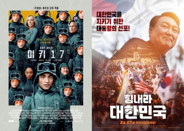 영화'미키17''힘내라대한민국'포스터./[마이데일리=이정민기자]2월28일,극장가에흥미로운대결이펼쳐졌다.봉준호감독의신작'미키17'과윤석열대통령을다룬다큐멘터리'힘내라윤석열'이같은주에개봉한것이다.하나는세계적인거장감독이연출한SF블록버스터,다른하나는대한민국대통령모습을기록한정치다큐멘터리.둘다'생존'을이야기하지만,우리가극장에서마주하게될세계는극과극이다.2025년2월20일오전서울코엑스메가박스에서진행된'미키17'기자간담회에서봉준호감독이취재진의질문에답하고있다.'미키17'은위험한일에투입되는소모품(익스펜더블)으로,죽으면다시프린트되는미키가17번째죽음의위기를겪던중,그가죽은줄알고'미키18'이프린트되면서벌어지는예측불허의이야기를그리는영화다.올상반기최대기대작중하나로꼽힌봉준호감독의할리우드영화'미키17'은개봉일인28일에30만명이넘는예매관객수를기록하며압도적인성적을보였다.영화관입장권통합전산망에따르면이날오전7시기준'미키17'의예매율은68.5%로,예매관객수는31만9000명에달했다.이는경쟁작인'퇴마록'(5.0%,2만3000여명),'캡틴아메리카:브레이브뉴월드'(4.8%,2만2000여명)를압도하는수치다.대체공휴일이있는3월3일까지봉감독의독주가이어질것으로예상된다.아카데미4관왕을차지하며K콘텐츠의세계적위상을드높인'기생충'이후봉감독이6년만에내놓은신작'미키17'은얼음행성개척에투입돼위험한임무를수행하다가죽으면다시태어나기를반복하는복제인간미키의이야기다.원작소설을기반으로한봉감독의첫SF영화이자,1700억원(1억1800만달러)의제작비가투입된대작이다.영화'힘내라대한민국'포스터반면'힘내라대한민국'은윤석열대통령의12·3비상계엄선언과이후상황을보수적시각에서조명한다큐멘터리로,윤대통령지지자들이주로찾고있다.배우최윤슬이내레이션을맡았으며,6.25전쟁전후남북한의이념대립과국가상황을강조하며윤대통령의계엄선포를필연적인선택으로묘사한다.서울성동구의한멀티플렉스영화관에서는27일개봉한'힘내라대한민국'이3차례상영됐으며,오전첫상영에서100석이넘는좌석중대부분이예매되었다.탄핵심판변론이마무리된지이틀만에개봉하며,윤대통령의정치적선택을지지하는이들에게주목받고있다.영화'미키17'스틸컷대중의관심은어디로향할까?'미키17'은워너브러더스가배급하는글로벌대작이며,로버트패틴슨을비롯한할리우드스타들이출연한다.기대감이높고,해외에서도주목하는작품이다.반면'힘내라대한민국'은정치다큐멘터리라는특성상특정관객층을겨냥할가능성이크다.영화관에서윤대통령을만나고싶은이들이얼마나될지는미지수다.또한,정치다큐멘터리는대중적인흥행을끌어내기쉽지않다.정치적성향에따라관객이나뉘는만큼,이번에도흥행성적이크게엇갈릴가능성이높다.과연극장에서펼쳐진이흥미로운대결에서관객의선택은어디로향할지관심이집중되고있다.Copyright©마이데일리.무단전재및재배포금지.