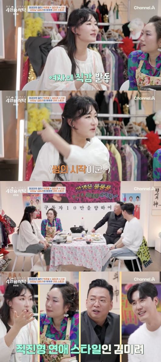 [OSEN=임혜영기자]개그우먼김미려가러브스토리를공개했다.24일방송된채널A‘절친토큐멘터리–4인용식탁’(이하4인용식탁)에는코미디언정경미가출연,절친신성,김미려,박준형을초대했다.김미려는정성윤과의러브스토리를공개했다.김미려는“정선희선배랑이재황씨가친한데우리남편이이재황오빠랑친하다.(모임에)왔는데빨간색의붙는티를입었다.내남자가될것이라는생각도안해봤다.어느날밤에모르는번호로전화가왔다.받았는데‘누나어디세요’해버리더라.일없으면술한잔하자고.냉큼나갔다”라고첫만남을회상했다.김미려는“이성에꽂히면저돌적으로나가는스타일이다.남편한테는달랐다.옆에있으면편안한누나가됐다.그러다가어느순간부터(남편)눈에하트가보이더라.크리스마스이브에집에엄마도와계신상황이었다.데려다준다더라.집앞까지왔다.보내는데안가는것이다.갑자기다가오더라.목도리를벗기는데‘다른것도다벗겨버리지’이런마음이었다.둘이아무말도없이뽀뽀만했다”라고말해설렘을유발했다.그런가하면김미려는부캐릭터를적극활용하며열심히활동을하게된것에대해“개그무대가없어지고시장이옮겨왔다.굶주린것도있다.이왕하는거돈벌이도되면좋겠다.내가웃는모습을보고우리남편이좋아한다”라고설명했다./[email protected][사진]채널A‘절친토큐멘터리–4인용식탁’Copyright©OSEN.무단전재및재배포금지.