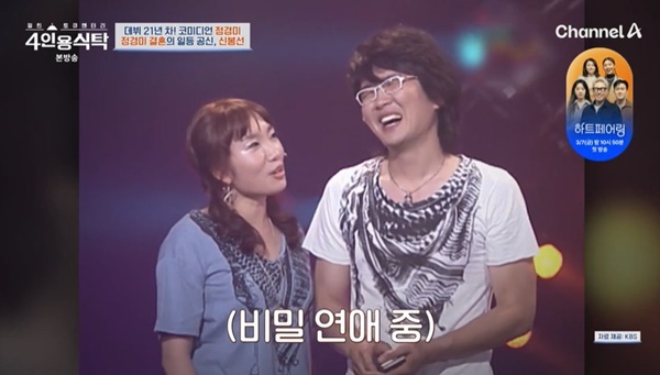 채널A‘절친토큐멘터리4인용식탁’캡처채널A‘절친토큐멘터리4인용식탁’캡처[뉴스엔유경상기자]정경미가남편윤형빈과러브스토리를밝혔다.2월24일방송된채널A‘절친토큐멘터리4인용식탁’에서는코미디언정경미(44세)가절친박준형(51세),김미려(42세),신성(39세)을초대했다.정경미는남편윤형민을자신이먼저좋아했다며“성실하고멀끔한모습이마음에들었다.동기인데높임말을써서어색했다.신봉선도움을많이받았다.오늘영화볼래요?하고내가같이나가고.신봉선이자리를마련해줬다.동기모임에같이가고그랬다.동기들도몰랐다.윤형빈은내가좋아하는게티가났을거다.다른동기들은눈치를못채도우리둘은썸이있었다”고말했다.이어정경미는“우리둘다똑같은위치니까소속사도없고신인때대전에정월대보름달타령행사가있었다.매니저도없고운전도못해서어떻게가나하는데오빠가제가가드릴까요?가는길에휴게소가있다.목걸이하나주면서고백하더라”며연인이된윤형빈의로맨틱한휴게소고백도털어놨다.그러고나서두사람은같이개그코너를했다고.정경미는“안상태선배가윤형빈과코너를짰다.여자역할이필요하니나를낀거다.우리가그코너를1년넘게했다.안상태선배는몰랐다”며“나중에사귄다는걸알고배신감같은.어떻게그럴수가있냐고하더라”고비밀연애고백후안상태의반응도전했다.(사진=채널A‘절친토큐멘터리4인용식탁’캡처)뉴스엔유경상yooks@기사제보및보도자료[email protected]ⓒ뉴스엔.무단전재&재배포금지Copyright©뉴스엔.무단전재및재배포금지.
