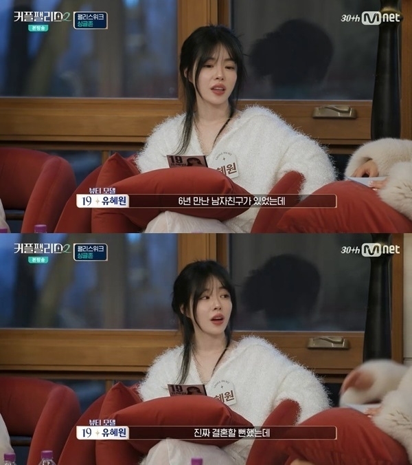 커플팰리스2.사진|엠넷[스포츠서울|박경호기자]‘커플팰리스2’유혜원이전남친을언급했다.지난5일방송된Mnet예능프로그램‘커플팰리스2’에서는팰리스위크합숙을시작한싱글남녀33인의이야기가그려졌다.매칭된상대와단둘이결혼을준비하는‘커플존’과새로운상대를찾을수있는‘싱글존’으로선택지가나뉜상황에서폭풍처럼휘몰아치는감정선들이수면위로드러나며설렘도파민을유발했다.이날방송에서유혜원은“사실천번만번고민했다.제가사연이좀있기때문에‘민폐를끼치지않을까’용기를내지못했다”라며솔직한마음을고백했고,이에황재근도비로소유혜원에대한오해를풀며마음을여는모습을보였다.이후유혜원은연애스토리를묻는오신다의질문에“6년만난남자친구가있었는데제가고백했다.양쪽부모님도다만나고진짜결혼할뻔했다.저는사연이있어서헤어지게됐다”라고털어놨다.남자출연진사이에서도유혜원에대한이야기가나왔다.민동성은“(유혜원님이)엄청유명한분인데기사화된게2개있다.하나는XX랑있었고,하나는농구선수”라며빅뱅승리,농구선수허웅과의열애설을언급해눈길을끌었다.한편,‘커플팰리스2’는매주수요일오후10시40분엠넷과tvN에서동시방송된다[email protected]©스포츠서울.무단전재및재배포금지.