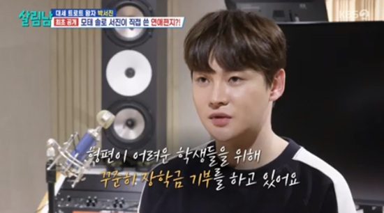 KBS2TV'살림하는남자들시즌2'8일방송KBS2TV'살림하는남자들시즌2'(서울=뉴스1)김보기자=가수박서진이모교에장학금을기부하고있다고밝혔다.8일오후방송된KBS2TV'살림하는남자들시즌2(이하살림남)'에는가수박서진이자신의모교에방문하는장면이공개됐다.이날박서진은동생박효정과함께자신이졸업한모교삼천포초등학교에방문했다.가장먼저만난사람은이학교의교장이었다.교장은박서진을반기면서도박효정을더반가워하며"삼천포에서는서진군보다더많이알아주던데"라고말해웃음을자아냈다.이어교장은박서진의KBS연예대상신인상수상을축하하며"삼천포가(박서진을)얼마나자랑스러워하는지모른다"라고말했다.교장은"모교와후배들을위해서늘발전기금과장학금을준것에대해서고맙다"라고말했다.이에대해박서진은자신의학창시절을떠올리며"급식비밀리고수학여행비,교복맞추는비용없어서난감할때후원해주셔서제가많은도움을받았다"라고말했다.그러면서"그때그고마움을어떻게든표현해보고싶어서이렇게후원하게됐다"고말했다.백지영은이에"이건선순환이다"라고말하며박서진을기특해했다[email protected]©뉴스1.Allrightsreserved.무단전재및재배포,AI학습이용금지.
