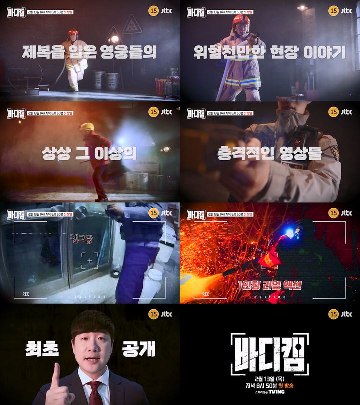 [서울=뉴시스]JTBC'바디캠'은13일오후8시50분첫방송한다.(사진=JTBC'바디캠'제공)[email protected]*재판매및DB금지[서울=뉴시스]서다희인턴기자=JTBC'바디캠'이13일오후8시50분첫방송된다.방송인배성재,개그맨장동민,배우송지효,JTBC강지영아나운서,개그맨신규진이MC로발탁됐다.이프로그램은소방관과경찰관의바디캠영상을통해긴박한현장이야기를전달하는대국민안전프로젝트다.단순히사건,사고현장을사실적으로재구성하는것에그치지않는다.유용한안전상식과위급상황대처법을함께알려줘유익함을더할예정이다.'바디캠'은리얼한현장의모습을담은티저영상을6일공개했다.티저영상에는소방관과경찰관이바디캠을착용하고긴급출동하는모습이그려졌다.소방호스,구조용튜브,테이저건등실제현장에서사용되는장비들을들고달리는장면은현장긴박함을그대로전했다.이어'제복을입은영웅들의위험천만한현장이야기','상상그이상의충격적인영상들'이라는문구가눈에띈다.이는'바디캠'의핵심메시지를강조한것이다.특히실제'바디캠'영상들이등장해긴장감을극대화했다.앞으로선보일'바디캠'영상들에대한기대감을높였다.경찰관이유리문을깨고들어가범죄자를제압하고,소방관이화재를진압하는등실감나는상황들이공개됐다.☞공감언론뉴시스[email protected]©뉴시스.무단전재및재배포금지.