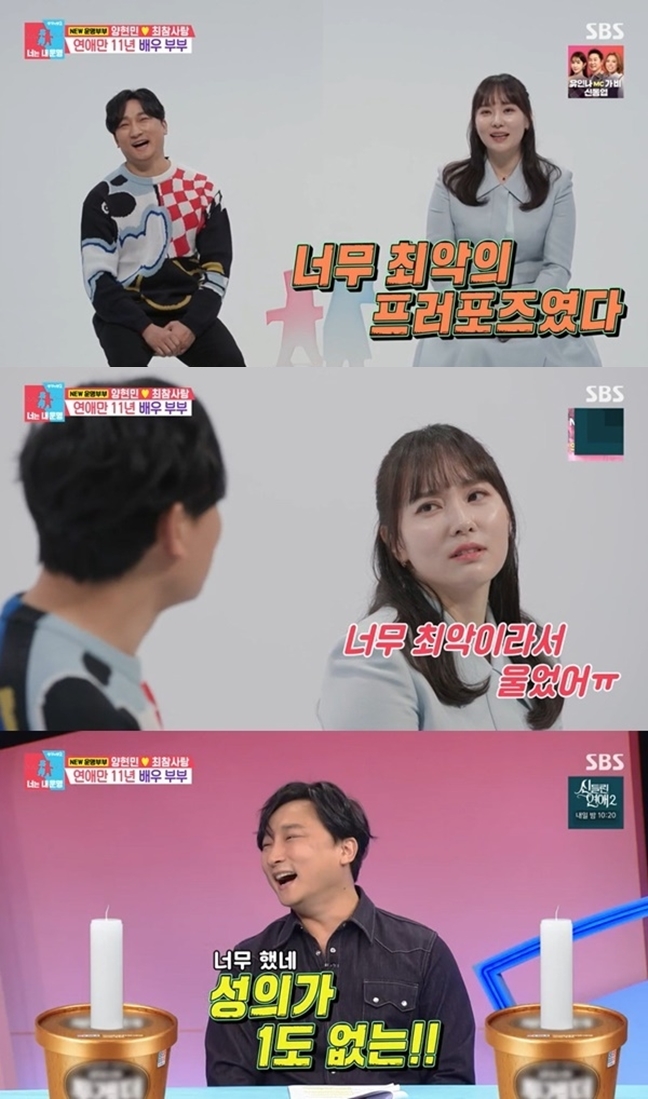 ▲출처|SBS'동상이몽2-너는내운명'캡처[스포티비뉴스최신애기자]최참사랑이남편양현민의프러포즈를폭로했다.3일방송된SBS'동상이몽2-너는내운명'에는양현민-최참사랑부부가출연했다.이날양현민-최참사랑은28살,23살에만나11년열애끝에결혼했다고밝혀놀라움을안겼다.특히최참사랑은남편에게받은프러포즈에대해"반지랑여러사람이없는둘만의공간에서누가찍어주면영상이남아서두고두고볼수있어서좋겠다고세가지를얘기했다"고운을뗐다.그러면서최참사랑은"그런데강원도에놀러가서케이크가없어서투게X아이스크림에다가양초를꽂아서반지랑함께왔다.그런데영상을찍어줄사람이없어서자기가휴대폰으로찍으면서프러포즈를했다"고폭로했다.그러자양현민은"(아내가)울긴울었다"고증언했고,최참사랑은"너무최악이라울었다"고바꿔현장을초토화시켰다.실제로이현이는"양초를보는순간박차고나갈것같다.제사지내?"라며놀랐고,서장훈은"사랑씨가착하네~"라고했다.<저작권자ⓒSPOTVNEWS.무단전재및재배포금지>Copyright©스포티비뉴스.무단전재및재배포금지.