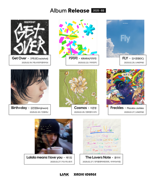 ▲씬디라운지가2월추천음반을소개했다.제공|한국음악레이블산업협회[스포티비뉴스=김원겸기자]씬디라운지가올2월발매된앨범중들어야할추천라인업을공개했다.이번라인업은장르를넘나드는신선한사운드와독창적인음악적시도가돋보이는앨범들로구성되어있다.2월19일,록스타뮤직앤라이브소속의글램메탈밴드크랙샷이신곡'겟오버'를발표했다.이곡은어려운고난과시련을극복하겠다는결의가담겨있으며,크랙샷의폭발적인에너지를잘드러낸다.팀의리더윌리K가작사및작곡을맡았고,드러머대니리가편곡에참여하여깊이있는의미를더했다.22일에는까미뮤직소속전자음악가키라라가4년만에발표한다섯번째정규앨범'키라라'를공개했다.키라라는데뷔11년차를맞아'음악을만드는순수한즐거움'이라는주제를담아냈다.선우정아,언텔,장명선,스월비,예람,할로우잰,한정인등다양한아티스트들과의협업을통해새로운음악적색채를입혔다.키라라는오는4월19일홍대무신사개러지에서단독쇼케이스공연을진행할예정이다.UNDFND소속아티스트김시훈의두번째싱글'플라이'는25일발매되어팬들에게감사의마음을전하고자제작됐다.이곡은김시훈이직접작사및작곡에참여하여자신의진심을담아낸작품으로,'플라이'라는제목은더높이날고싶다는다짐과함께팬들과함께계속나아가겠다는약속의의미를지니고있다.인플래닛소속김진원은25일첫싱글'버스+데이'를발매하고싱어송라이터발판을공고히했다.이곡은미래를살아갈수있다는희망의메시지를담고있으며,김진원의뛰어난가창력과매력적인고음이빛을발한다.엠피엠지뮤직소속의이준형은신곡'코스모스'를발표했다.이곡은꽃에대한감성을음악으로풀어내며,이준형의새로운프로젝트인'플로랄'시작을알린다.2월27일에는플라시보정키스,에디킴,홍이삭의세팀이음반을공개했다.플라시보정키스새싱글'프렉클스'는다양한마케팅콘텐츠와함께선보일예정이며,기존의틀을깨는실험적인음악을담았다.미스틱스토리소속가수에디킴은R&B디지털싱글'라라라민즈아이러브유'를발표했다.이곡은사랑하는사람과의행복한순간을노래하며,따뜻한감성과몽환적인분위기로청중에게다가갈예정이다.끝으로,홍이삭의EP'더러버스노트'가발매되었으며,이앨범은사랑의다양한감정을담아내고있다.타이틀곡'나는너만사랑할게'를포함한다섯곡으로구성되어있다.홍이삭은오는3월14일부터16일까지서울한남동블루스퀘어마스터카드홀에서콘서트'더러버스'를진행할예정이다.씬디라운지를운영하는한국음악레이블산업협회는중소형기획사와소속사없이활동하는인디뮤지션,소규모공연장의권익을위해다양한지원프로그램을운영중이다.<저작권자ⓒSPOTVNEWS.무단전재및재배포금지>Copyright©스포티비뉴스.무단전재및재배포금지.