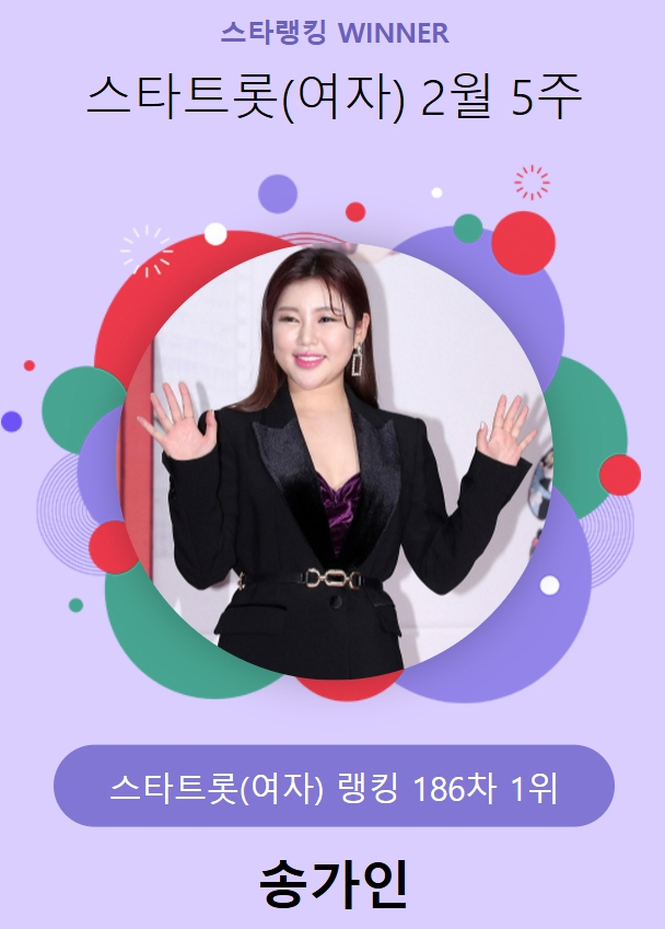 [스타뉴스|이승훈기자]/사진=스타뉴스스타랭킹가수송가인이스타랭킹스타트롯여자랭킹1위에올랐다.송가인은지난달27일오후3시1분부터6일오후3시까지진행된2월5주(186차)스타랭킹스타트롯여자랭킹투표에서김태연,김다현을꺾고1위를차지했다.이번투표에서6만8788표를얻은송가인에이어2위는3만9014표를획득한김태연,3위에는3만4626표로김다현이이름을올렸다.한편스타랭킹은팬들이직접자신의최애스타에투표해순위를결정하는랭킹투표다.모바일에서투표를할경우투표인증서도받을수있고투표결과순위에따라스타에게다양한특전이제공된다.4주연속1위로선정된스타는옥외전광판광고에실린다.4주연속1위스타의팬들은옥외전광판광고영상팬서포트도가능하다.제안은스타뉴스공식이메일([email protected])로하면된다.3월2주(187차)스타랭킹스타트롯여자랭킹투표는6일오후3시1분부터13일오후3시까지진행된다.이승훈기자[email protected]©스타뉴스&starnewskorea.com,무단전재및재배포금지