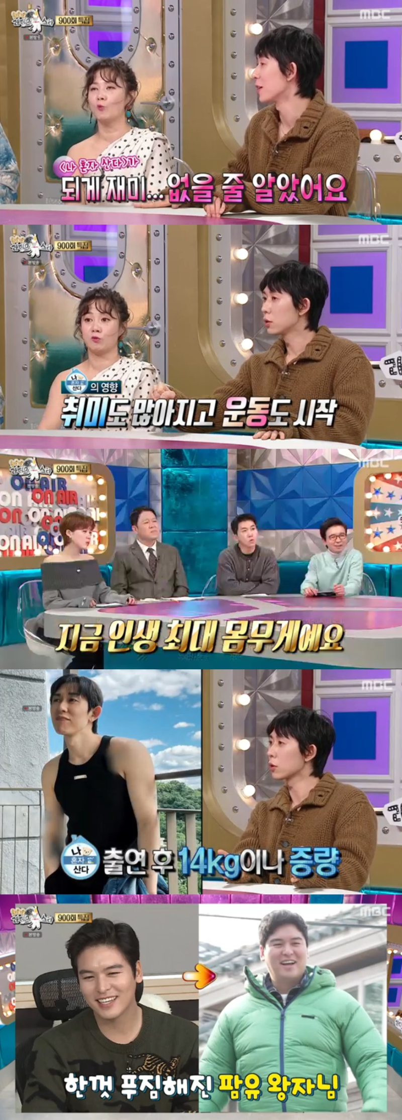 가수코드쿤스트가‘나혼자산다’출연이후바뀐점에대해말했다.5일방송된MBC‘라디오스타’에는김종민,문세윤,박나래,코드쿤스트가출연해900회특집을꾸몄다.이날코드쿤스트는“‘나혼자산다’도처음나갈땐딱한번만하겠다고했다.되게재미가없을줄알았다.떠드는것이아니라혼자살아가는모습을보는것이라재미없을줄알았다”며“다른사람들의삶을보면서배울점이많다”고‘나혼자산다’의장점을말했다.그러면서“가장결정적인것은정말집밖에안나갔었는데이프로그램을하면서집밖으로나가는재미가생겼다.취미도많아지고운동도했다”고설명했다.지금인생최대몸무게라고밝힌코드쿤스트는“‘나혼자산다’하면서14kg가쪘다.지금보다14kg를더찔까봐걱정이다.장우형도처음나왔을때는말랐다”고전했다.한편‘라디오스타’는매주수요일오후10시30분방송된다.이수진기자[email protected]©일간스포츠.무단전재및재배포금지.