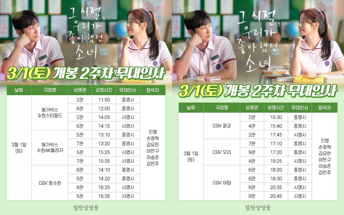 ‘그시절’진영X다현,관객들과만난다...개봉2주차무대인사확정(제공:영화사테이크공식계정)영화‘그시절,우리가좋아했던소녀’가개봉1·2주차무대인사에힘입어개봉2주차주말무대인사를확정지었다.‘그시절,우리가좋아했던소녀’는‘선아’(다현)에게고백하기까지수많은날을보낸철없었던‘진우’(진영)의열여덟첫사랑스토리.그시절의추억을불러일으키며관객들을사로잡고있는영화‘그시절,우리가좋아했던소녀’가뜨거운흥행세에힘입어천안,경기지역무대인사에나선다.개봉주부터개봉2주차주중까지다현을비롯한이선민,손정혁,김요한,이민구,이승준,김민주배우와조영명감독이무대인사를통해관객들과특별한만남을가졌다.관객들의성원에보답하고자추가무대인사를결정한영화의주역들은천안,경기지역극장가를찾아갈예정이다.2월28일,3월1일에진행되는무대인사는관객들의성원에보답하고자‘그시절티켓가무대인사’특별이벤트가진행된다.남녀노소누구나1만원에오픈될예정으로더욱많은관객들이배우들과함께영화의감성을나눌수있는기회가될것으로기대를모은다.28일은CGV천안펜타포트,CGV천안터미널을시작으로3월1일메가박스수원스타필드,메가박스수원AK플라자,CGV동수원,CGV광교,CGV오리,CGV야탑까지진영,손정혁,이민구,이승준,김민주배우와조영명감독이참석해천안및경기지역관객들과만남을가질예정이다.‘그시절티켓가무대인사’에대한자세한내용은극장별홈페이지및애플리케이션이벤트페이지내에서확인할수있다.‘그시절,우리가좋아했던소녀’는1주차무대인사에이어2주차주말무대인사를확정지으며특급팬서비스를예고해기대감을더하고있다.이다미기자bnt뉴스연예팀기사제보[email protected]©bnt뉴스.무단전재,재배포및AI데이터활용금지