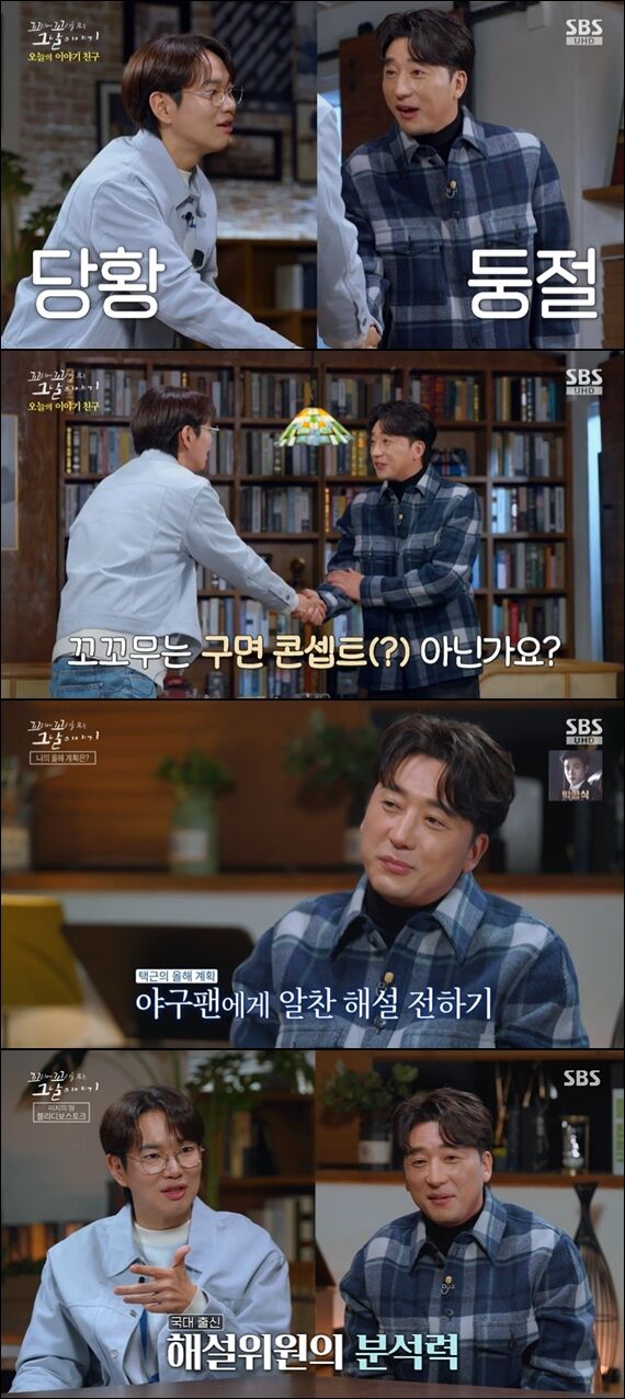 [SBS연예뉴스|강선애기자]'꼬꼬무'에출연한이택근SBS스포츠야구해설위원이다양한매력으로시선을사로잡았다.이택근은지난27일방송된SBS'꼬리에꼬리를무는그날이야기'(이하'꼬꼬무')의'철혈광복단-역사를뒤바꿀비밀작전'편에장성규의이야기친구로출연했다.'꼬꼬무'스튜디오에첫등장한이택근은허당스러운모습으로웃음을자아냈다.그는장성규에게"성규야진짜오랜만이다"라며반갑게악수를건넸는데,장성규는"우리처음만난거아니냐"라며어리둥절해했다.이택근은"우리만난걸로콘셉트정해서하는거아니냐"라며,장성규에게인사한이유를설명했다.알고보니친구에게편하게이야기하는콘셉트인'꼬꼬무'의설정에과몰입한이택근이초면인장성규를원래부터알고지낸것처럼대한것.이택근의다소허당스러운첫등장에장성규는웃음을빵터뜨렸다.하지만어설픈모습은잠시뿐이었다.그는'올해계획'을묻는질문에"야구해설을하고있기때문에,올시즌에도프로야구팬들한테퀄리티있는해설을해야한다"며남다른책임감을보였다.또장성규의질문에정답을척척맞히며,해설위원다운예리한분석력을빛내기도했다.이날'꼬꼬무'는일제강점기때일제가우리나라국민으로부터수탈했던현시세150억원에준하는자금을탈취하려했던독립비밀결사단'철혈광복단'의숭고한희생에대해소개했다.모든이야기를들은이택근은"관심은있었지만바쁘다는핑계로좀등한시했던역사고,'알아야된다'는당연한생각이가슴속에와닿았다"라고깊은감동을표현하며의미를되새겼다.한편이택근은지난해에이어2025시즌에도SBS스포츠프로야구해설위원으로활약한다.강선애기자[email protected]©CopyrightⓒSBS.Allrightsreserved.무단전재,재배포및AI학습이용금지