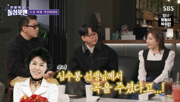 '신발벗고돌싱포맨'25일방송SBS'신발벗고돌싱포맨'캡처SBS'신발벗고돌싱포맨'캡처(서울=뉴스1)박하나기자=가수송가인이가수심수봉에게'눈물이난다'를선물받았다고밝혔다.25일오후에방송된SBS예능프로그램'신발벗고돌싱포맨'(이하'돌싱포맨')에서는가수변진섭,김정민,송가인이게스트로출격했다.정규4집으로돌아온송가인은심수봉이선물하고,프로듀싱한곡'눈물이난다'를소개해시선을모았다.송가인은"(심수봉이)후배에게처음으로선물한곡이다"라며작곡료도받지않았다고전해모두를놀라게했다.이에이상민이선배심수봉에게예쁨을받은비결을묻자,송가인은"무작정찾아갔다"라고고백해눈길을끌었다.송가인은심수봉과가까이산다고.이어송가인은마침심수봉이후배를위해쓴곡이있었다며"타이밍이잘맞았다"라고비화를전했다.한편SBS'신발벗고돌싱포맨'은파란만장연애스토리부터현실적인조언까지,게스트만족200%를보장하는삐딱한돌싱들의토크쇼로매주화요일오후9시에방송된다[email protected]©뉴스1.Allrightsreserved.무단전재및재배포,AI학습이용금지.